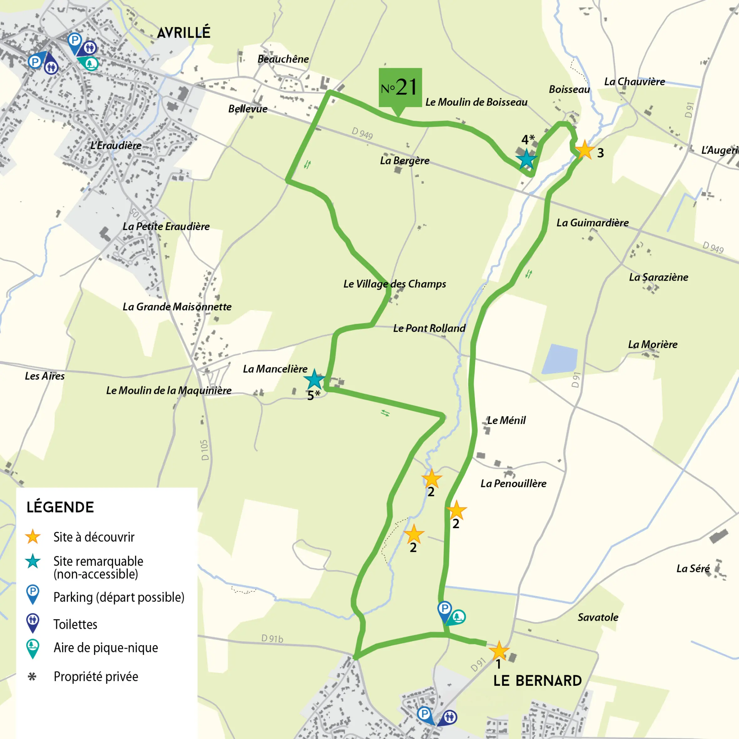 A découvrir : Dolmens de Savatole ; Dolmen de la Frébouchère ; Passage à gué ; Logis du Grand Boisseau ; Ferme de la Mancelière.