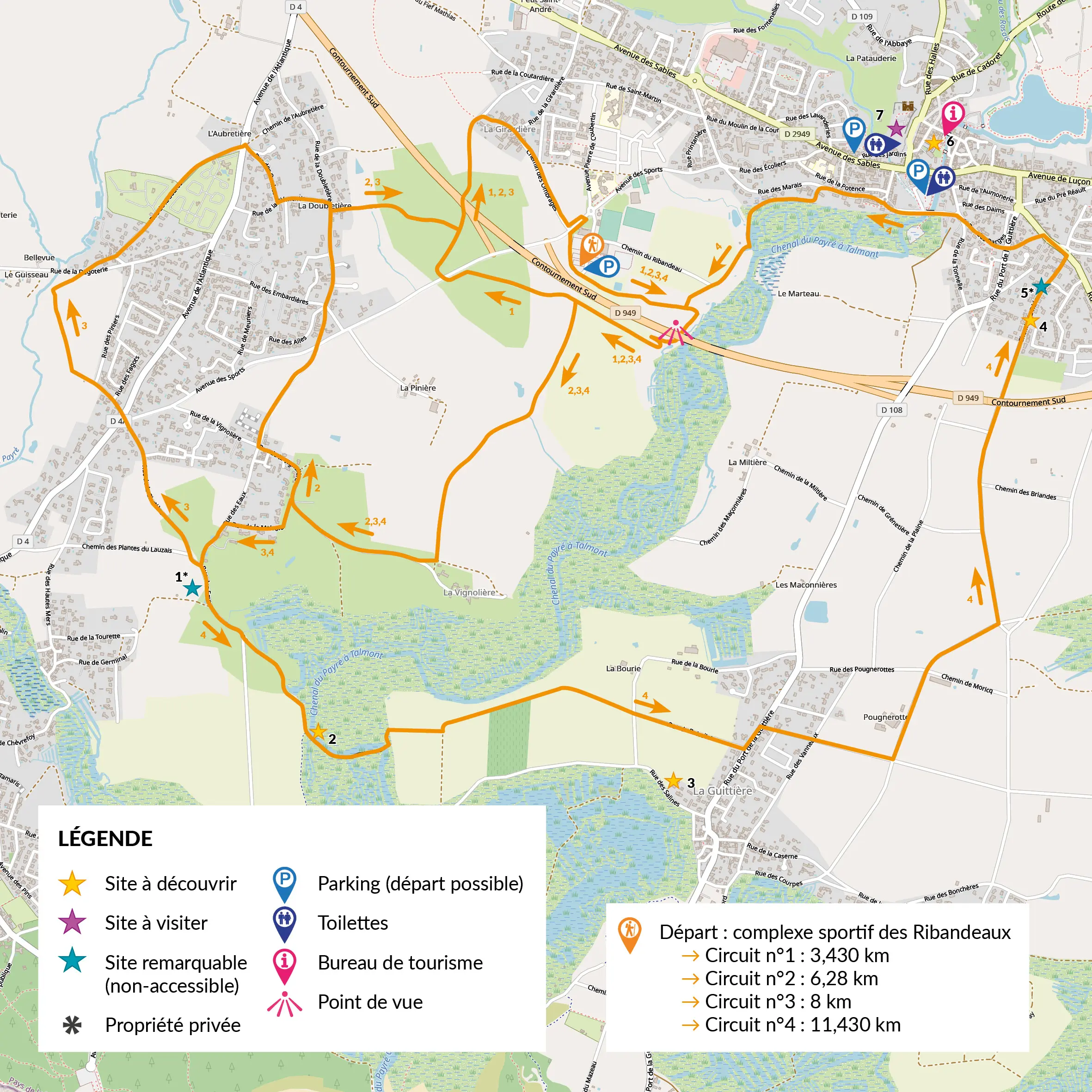 Circuits balisés en sens unique à partir du complexe des Ribandeaux à Talmont-Saint-Hilaire. A 500 mètres du départ des 4 circuits, découvrez le Belvédère des Ribandeaux, point de vue sur la ria du Payré avec une table d’orientation.