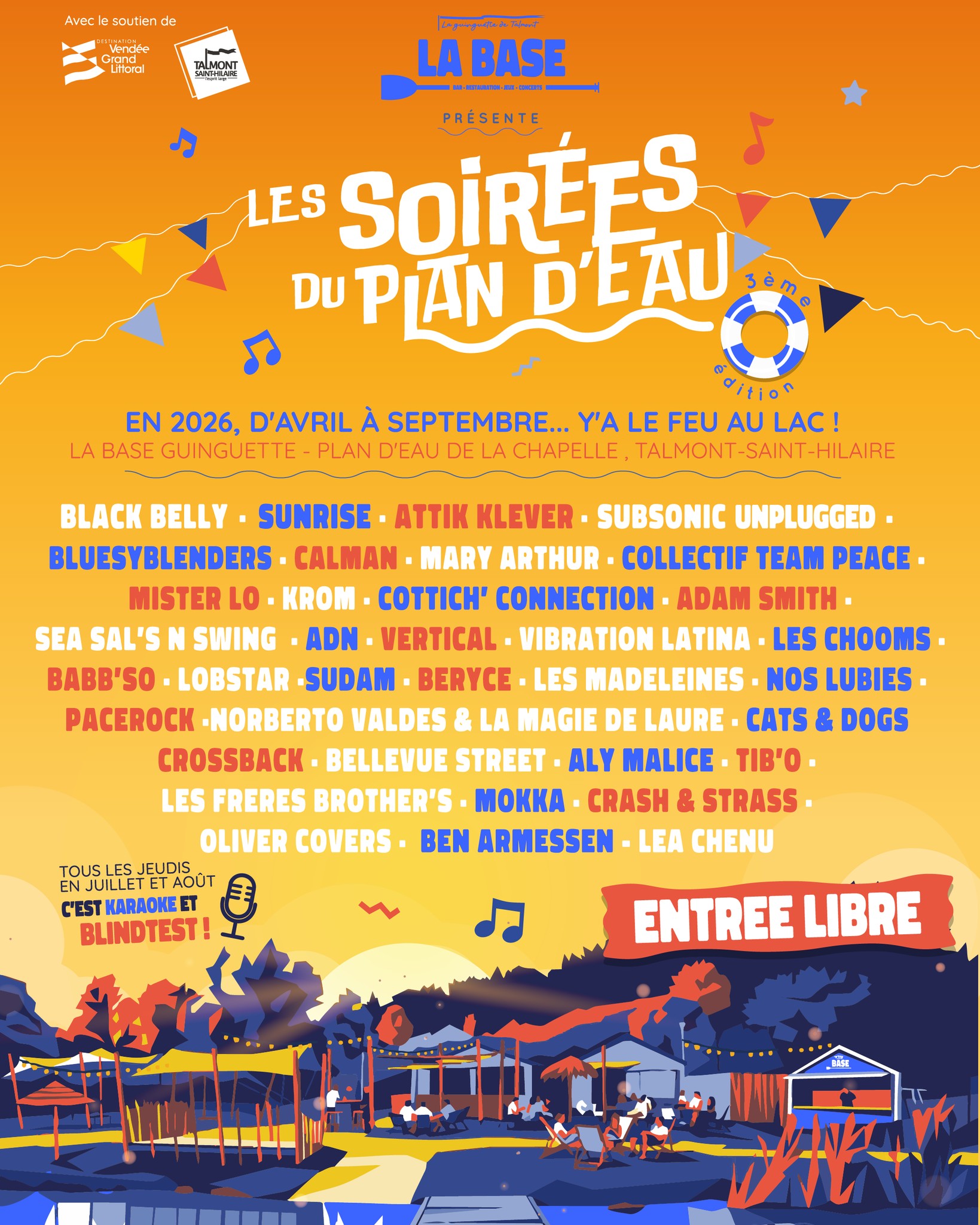 Agenda >>Concert et spectacle Concerts des Soirées du Plan d’Eau Les soirées du plan d'eau, avec en avril : Black Belly le 18/04 et Sunrise le 25/04 ! Description Un parfum d’été s’invite déjà au plan d’eau, et les premières soirées reviennent à La Base pour lancer ce mois comme on l’aime. Deux rendez-vous pour se retrouver, profiter du cadre et relancer les Soirées du Plan d’Eau. Samedi 18 avril : Concert avec Black Belly , reprises de Rock & Blues Samedi 25 avril : Concert avec Sunrise , Pop Rock International & Variétés françaises. Entrée libre. Pratique Date(s) de la manifestation : Du 18/04/2026 au 18/04/2026 Horaires de la manifestation19:30Du 25/04/2026 au 25/04/2026 Horaires de la manifestation19:30 Vous rendre à cet endroit Adresse de l'offre : La Base Guinguette12 Impasse du Lac85440 TALMONT-SAINT-HILAIRE https://www.facebook.com/p/La-Base-Guinguette-61558158863039/ Contact : La Base Guinguette 07 66 44 84 33 Agenda Concert et spectacle