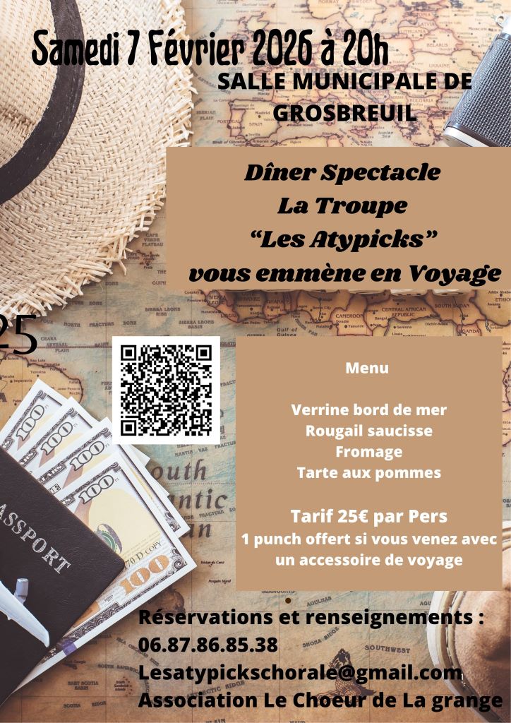 Agenda >>Concert et spectacle Dîner spectacle « Les Atypicks » La troupe "Les Atypicks" vous emmène en voyage Description Tarif : 25€ par personne Menu : verrine bord de mer/rougail saucisse/fromage/tarte aux pommes 1 punch offert si vous venez avec un accessoire de voyage. Réservations et renseignements par téléphone. Pratique Date(s) de la manifestation : Du 07/02/2026 au 07/02/2026 Horaires de la manifestation20:00 Vous rendre à cet endroit Adresse de l'offre : Salle municipale85440 GROSBREUIL Contact : Association Le Choeur de la Grange 06 87 86 85 38 lesatypickschorale@gmail.com Agenda Concert et spectacle