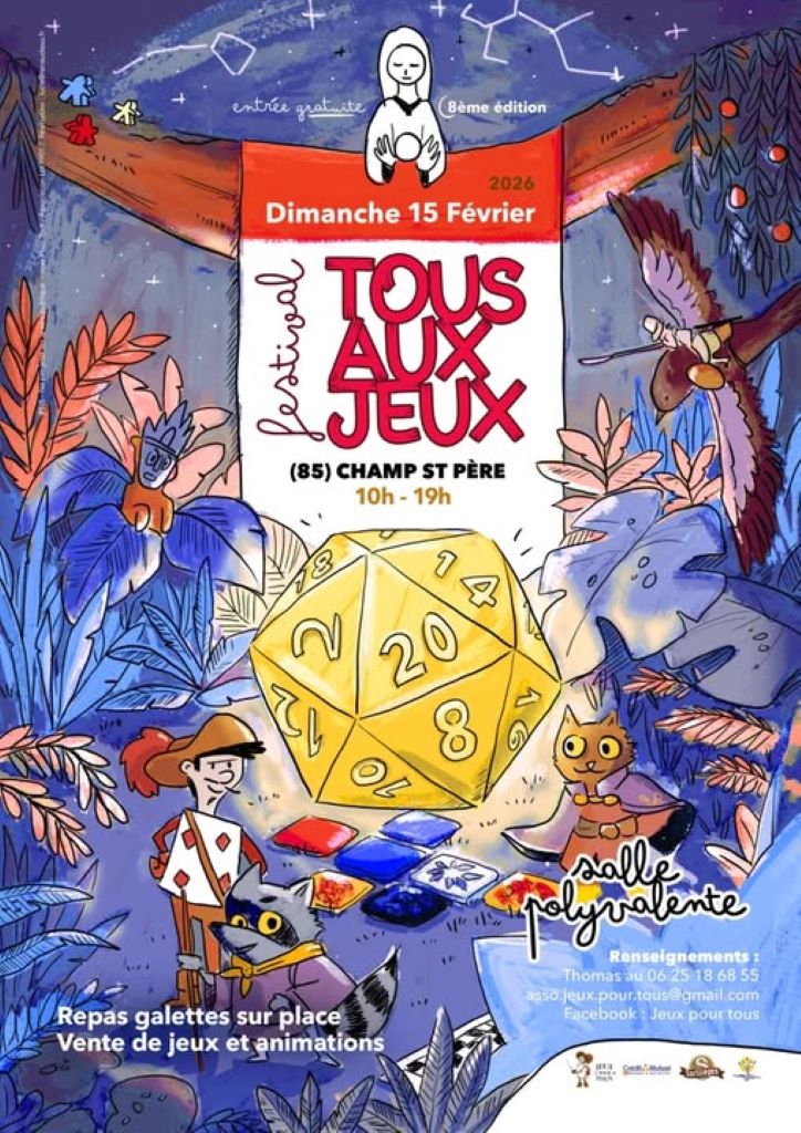 Agenda >>Concert et spectacle Festival Tous aux Jeux Entrée gratuite Description 8ème édition. Repas : galettes sur place. Vente de jeux et animations. Pratique Date(s) de la manifestation : Du 15/02/2026 au 15/02/2026 Horaires de la manifestation10:00 - 19:00 Vous rendre à cet endroit Adresse de l'offre : Salle polyvalente85540 LE CHAMP-SAINT-PERE Contact : Association Jeux Pour Tous 06 25 18 68 55 Agenda Concert et spectacle