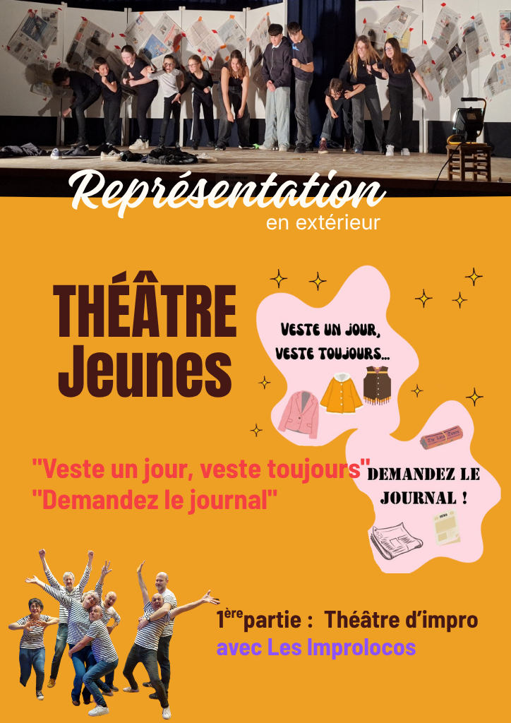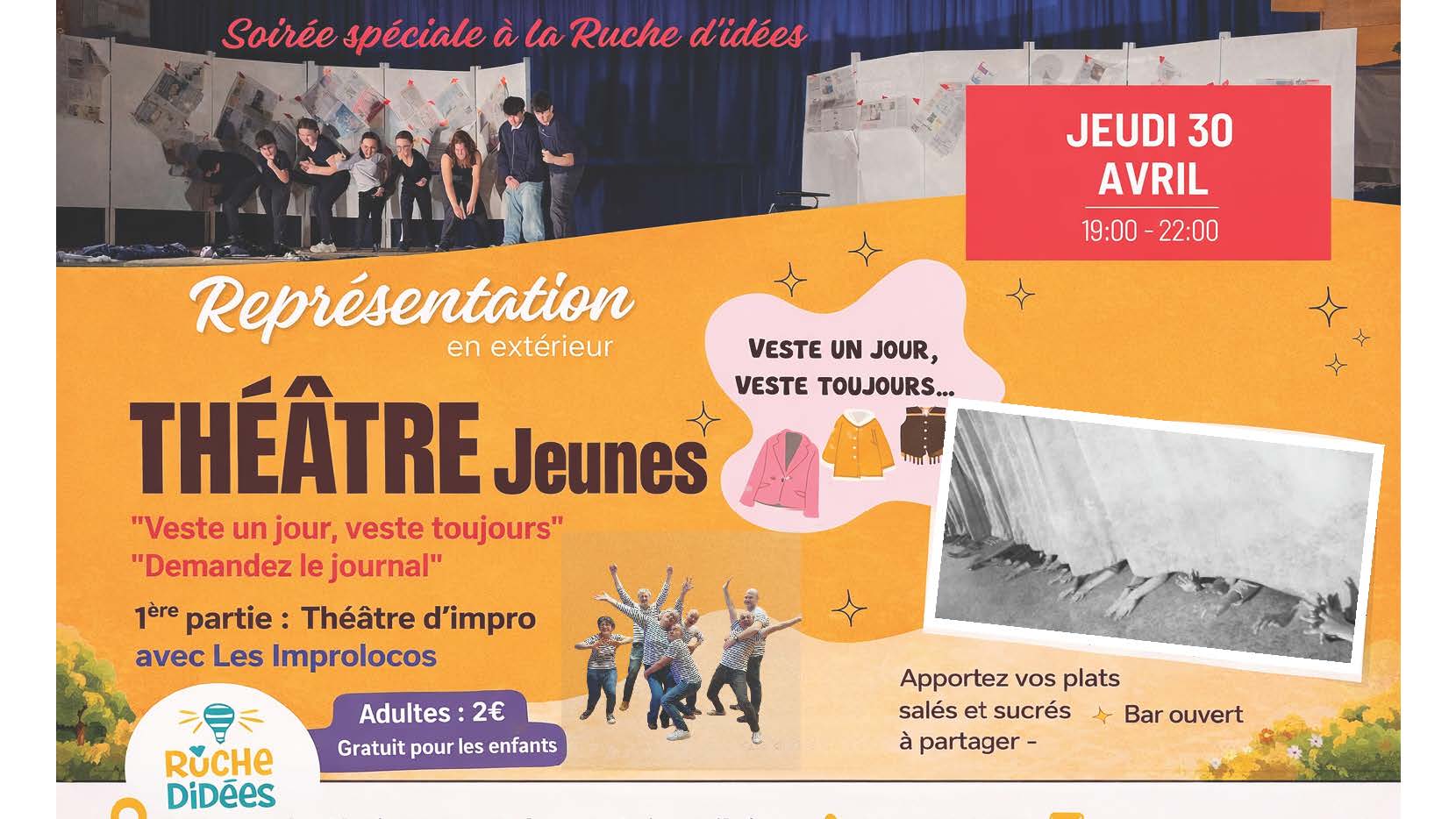 Agenda >>Concert et spectacle Représentation du Théâtre jeunes Théâtre jeunes et improvisation : les jeunes de la troupe de La Ruche interprète en extérieur la pièce originale, répétée cette année ! Description La 1ère partie est proposée par la troupe de théâtre d’improvisation sablaise, Les Improlocos Une soirée riche en créativité, pleine d’humour et de talent à ne pas manquer ! Le bar sera ouvert. Apportez vos encas salés et sucrés à partager pour prolonger la soirée dans une ambiance chaleureuse. Tarif : 2€ – gratuit pour les enfants Pratique Date(s) de la manifestation : Du 30/04/2026 au 30/04/2026 Horaires de la manifestation19:00 Vous rendre à cet endroit Adresse de l'offre : La Ruche d'idées292 Rue du Chai85440 TALMONT-SAINT-HILAIRE Contact : La Ruche d'Idées 02 51 96 02 76 accueil@ruche-didees.com Agenda Concert et spectacle