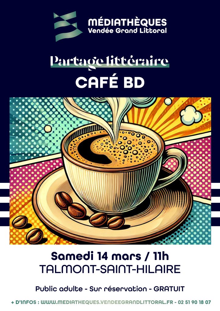 Agenda >>Culture et exposition Café BD Public adulte - Sur réservation Description Autour d’un café ou d’un thé, venez partager vos expériences BD autour d’une thématique : « Coups de coeur » le 31/01 « Cinéma » le 14/03 « Voyage » le 20/06 Agenda complet des animations dans les médiathèques de Vendée Grand Littoral : Animations à venir . Pratique Date(s) de la manifestation : Du 20/06/2026 au 20/06/2026 Horaires de la manifestation11:00Du 14/03/2026 au 14/03/2026 Horaires de la manifestation11:00 Vous rendre à cet endroit Adresse de l'offre : Médiathèque85440 TALMONT-SAINT-HILAIRE www.mediatheques.vendeegrandlittoral.fr Documents téléchargeables : Programme Médiathèque VGL 2025-2026 Contact : Vendée Grand Littoral 02 51 90 18 07 Agenda Culture et exposition