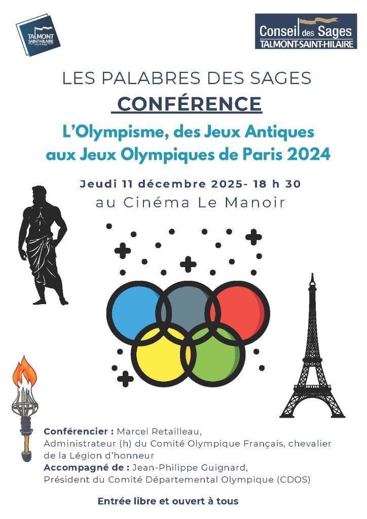 Agenda >>Culture et exposition Conférence sur l’Olympisme Les palabres des sages Description L’Olympisme, des jeux Antiques aux Jeux Olympiques de Paris 2024; Conférencier : Marcel Retailleau Administrateur (h) du Comité Olympique Français, chevalier de la Légion d’Honneur. Accompagné de : Jean-Philippe Guignard, Président du Comité Départemental Olympique (CDOS). Entrée libre et ouvert à tous. Pratique Date(s) de la manifestation : Du 11/12/2025 au 11/12/2025 Horaires de la manifestation18:30 Vous rendre à cet endroit Adresse de l'offre : Cinéma le Manoir85440 TALMONT-SAINT-HILAIRE Contact : Le Conseil des Sages Agenda Culture et exposition