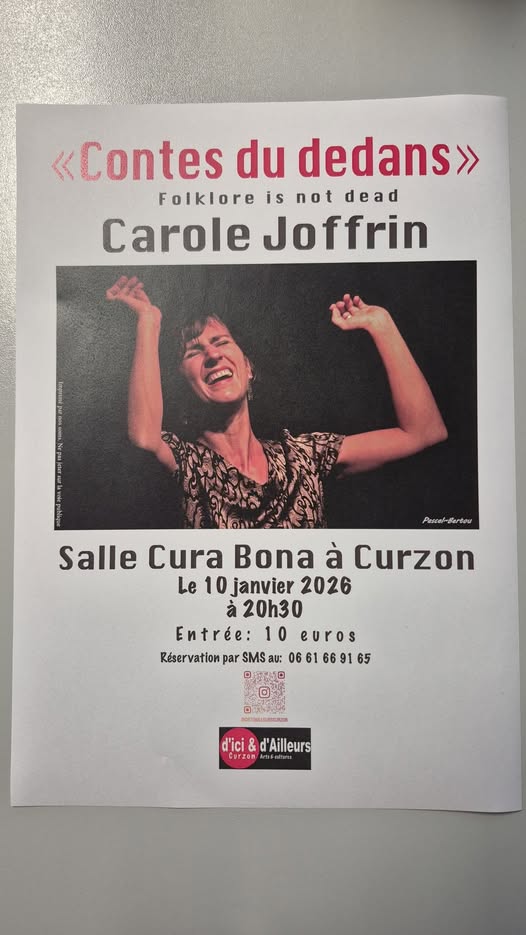 Agenda >>Culture et exposition Contes du Dedans Contes interprété par Carole Joffrin Description Entrée : 10€ Réservation par sms. Contes « Folklore is not dead ». Organisé par l’association Ici et d’Ailleurs. Pratique Date(s) de la manifestation : Du 10/01/2026 au 10/01/2026 Horaires de la manifestation20:30 Vous rendre à cet endroit Adresse de l'offre : Salle Cura Bona85540 CURZON Contact : Association Ici et d'Ailleurs 06 61 66 91 65 Agenda Culture et exposition