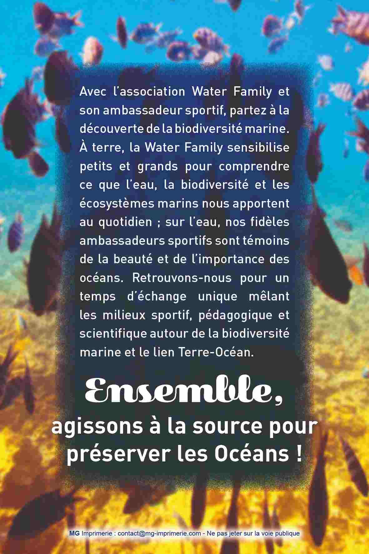 « Avec l’association Water Family et son ambassadeur sportif, partez à la découverte de la biodiversité marine. À terre, la Water Family sensibilise petits et grands pour comprendre ce que l’eau, la biodiversité et les écosystèmes marins nous apportent au quotidien ; sur l’eau, nos fidèles ambassadeurs sportifs sont témoins de la beauté et de l’importance des océans. Retrouvons-nous pour un temps d’échange unique mêlant les milieux sportif, pédagogique et scientifique autour de la biodiversité marine et le lien Terre-Océan. »