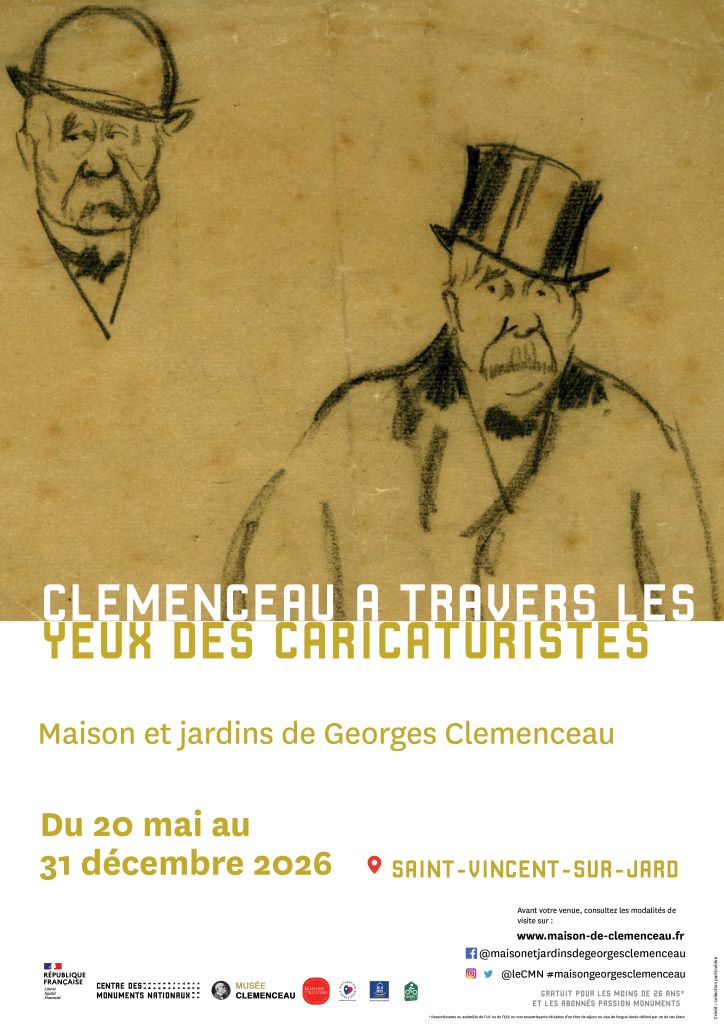 Agenda >>Culture et exposition Exposition « Clemenceau à travers les yeux des caricaturistes » Ouvert à tous Description Renseignements et réservations par téléphone. Pratique Date(s) de la manifestation : Du 20/05/2026 au 31/12/2026 Vous rendre à cet endroit Adresse de l'offre : Maison Georges ClemenceauRue Georges Clemenceau85520 SAINT-VINCENT-SUR-JARD www.maison.de.clemenceau.fr Contact : Maison et jardins de Georges Clemenceau 02 51 33 40 32 Agenda Culture et exposition