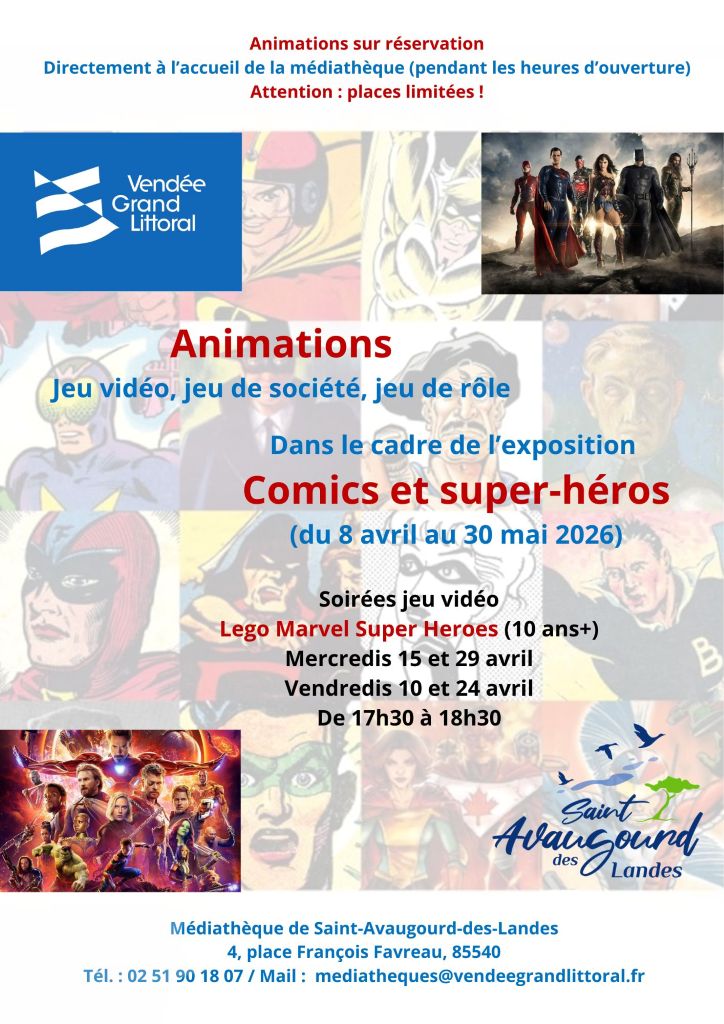 Agenda >>Culture et exposition Exposition « Comics et Super-Héros » Animations et soirées jeux vidéo dans le cadre de l'exposition Description Animations sur réservation – Directement à l’accueil de la médiathèque (pendant les heures d’ouverture). Attention : places limitées Animations : jeu vidéo, jeu de société, jeu de rôles. Soirées jeu vidéo – Lego Marvel Super Heroes (10ans et +) : les mercredis 15 et 29 avril, les vendredis 10 et 24 avril de 17H30 à 18H30. Organisé par le réseau des médiathèques de Vendée Grand Littoral. Pratique Date(s) de la manifestation : Du 08/04/2026 au 30/05/2026 Vous rendre à cet endroit Adresse de l'offre : Médiathèque4 place François FavreauSAINT-AVAUGOURD-DES-LANDES Contact : Médiathèque 02 51 90 18 07 mediatheques@vendeegrandlittoral.fr Agenda Culture et exposition
