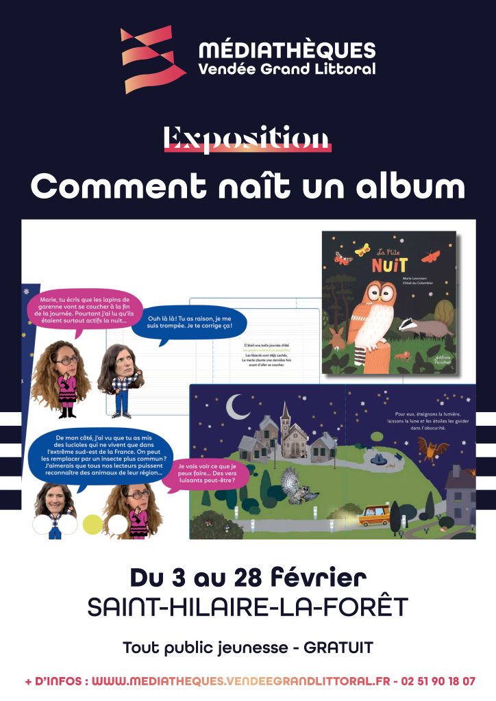 Agenda >>Culture et exposition Exposition « Comment naît un album » Tout public jeunesse Description En suivant pas à pas chaque étape de la conception de notre album « La P’tite Nuit », le public découvrira les coulisses de l’édition : choix du sujet, travail de l’autrice, de l’illustratrice et de la maison de l’édition. Par Ed.Ricochet. Agenda complet des animations dans les médiathèques de Vendée Grand Littoral : Animations à venir . Pratique Date(s) de la manifestation : Du 03/02/2026 au 28/02/2026 Vous rendre à cet endroit Adresse de l'offre : Médiathèque85440 SAINT-HILAIRE-LA-FORET https://vendeegrandlittoral-pom.c3rb.org/ Documents téléchargeables : Programme Médiathèques VGL 2025-2026 Contact : Réseau des Bibliothèques & Médiathèques Vendée Grand Littoral 02 51 90 18 07 Agenda Culture et exposition