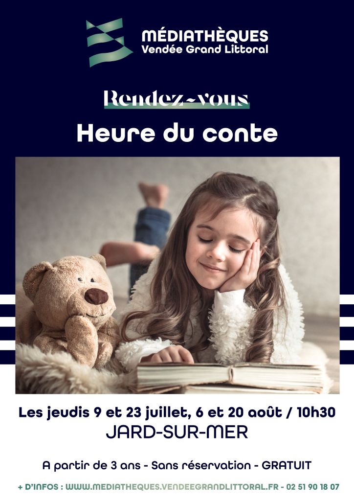 Agenda >>Culture et exposition L’heure du conte A partir de 3ans Description Contes pour enfants. Sans réservation et gratuit. Agenda complet des animations dans les médiathèques de Vendée Grand Littoral : Animations à venir . Pratique Date(s) de la manifestation : Du 09/07/2026 au 09/07/2026 Horaires de la manifestation10:30Du 23/07/2026 au 23/07/2026 Horaires de la manifestation10:30Du 06/08/2026 au 06/08/2026 Horaires de la manifestation10:30Du 20/08/2026 au 20/08/2026 Horaires de la manifestation10:30 Vous rendre à cet endroit Adresse de l'offre : Médiathèque85520 JARD-SUR-MER www.mediatheques.vendeegrandlittoral.fr Documents téléchargeables : Programme Médiathèque VGL 2025-2026 Contact : Vendée Grand Littoral 02 51 90 18 07 Agenda Culture et exposition