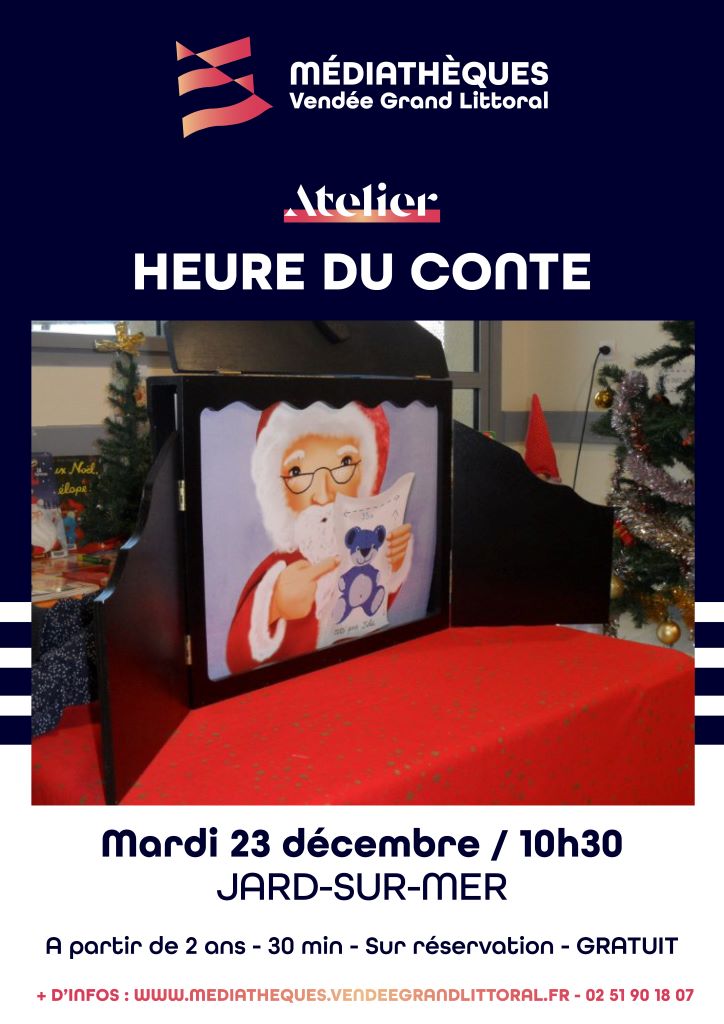 Agenda >>Culture et exposition L’Heure du conte A partir de 2ans - Sur réservation Description Kamishibaï de Noël. Durée : 30mn Agenda complet des animations dans les médiathèques de Vendée Grand Littoral : Animations à venir . Pratique Date(s) de la manifestation : Du 23/12/2025 au 23/12/2025 Horaires de la manifestation10:30 Vous rendre à cet endroit Adresse de l'offre : Médiathèque85520 JARD-SUR-MER https://vendeegrandlittoral-pom.c3rb.org/ Documents téléchargeables : Programme Médiathèques VGL 2025-2026 Contact : Réseau des Bibliothèques & Médiathèques Vendée Grand Littoral 02 51 90 18 07 Agenda Culture et exposition