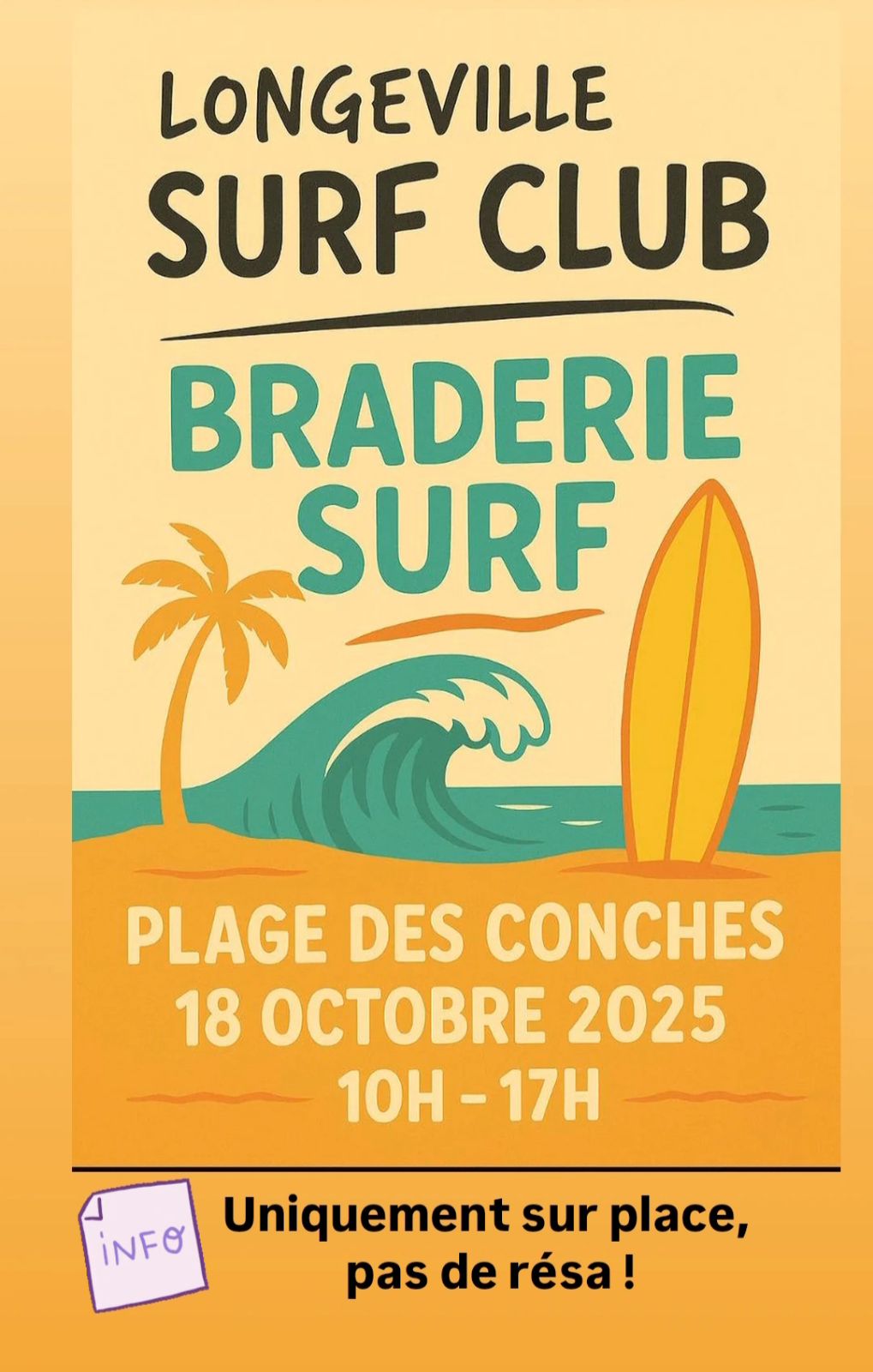 Agenda >>Fêtes populaires et animations de saison Braderie Surf Braderie du Longeville Surf Club - Uniquement sur place, pas de réservation Description Braderie du club : articles de surf. Pratique Date(s) de la manifestation : Du 18/10/2025 au 18/10/2025 Horaires de la manifestation10:00 - 17:00 Vous rendre à cet endroit Adresse de l'offre : Plage des Conches85560 LONGEVILLE-SUR-MER Contact : Longeville Surf Club 06 60 42 39 57 Agenda Fêtes populaires et animations de saison