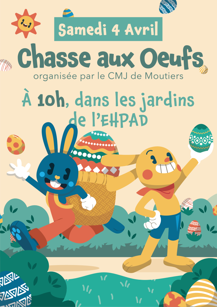 Agenda >>Fêtes populaires et animations de saison Chasse aux Oeufs Organisé par le Conseil Municipal des Jeunes Description Venez nombreux! Pratique Date(s) de la manifestation : Du 04/04/2026 au 04/04/2026 Horaires de la manifestation10:00 Vous rendre à cet endroit Adresse de l'offre : Les jardins de l'Ehpad85540 MOUTIERS-LES-MAUXFAITS Contact : Conseil Municipal des Jeunes de Moutiers Agenda Fêtes populaires et animations de saison