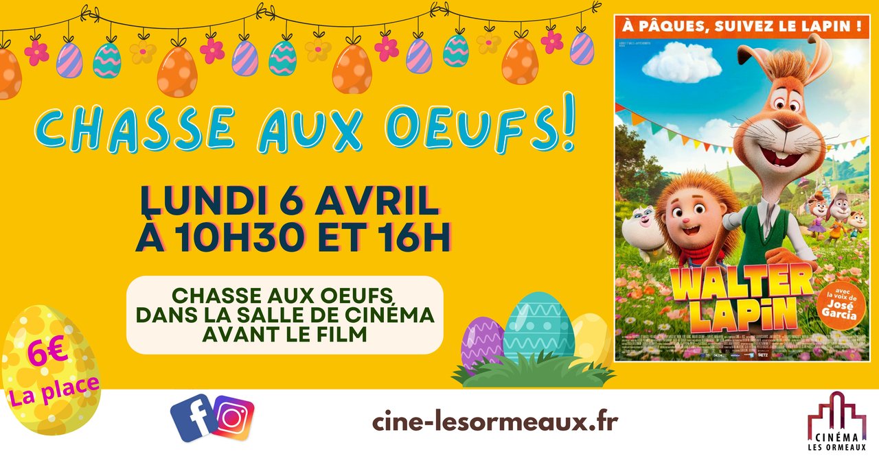 Agenda >>Fêtes populaires et animations de saison Chasses aux oeufs au cinéma ! Deux chasses aux oeufs organisées dans la salle de cinéma, avant les deux séances : à 10h30 et à 16h ! Description Participer aux chasses aux Å“<ufs organisées dans la salle de cinéma, pour faire le plein de chocolats, avant de vous installez-vous pour le film « Walter Lapin » ! -> une première chasse avant la séance de 10h30. -> une deuxième chasse avant la séance de 16h. Entrée payante au cinéma : 6€. Plus d’informations sur : Cinéma Les Ormeaux Pratique Date(s) de la manifestation : Du 06/04/2026 au 06/04/2026 Horaires de la manifestation10:30Précisions sur les ouverturesAvant les deux séances dé cinéma (10h30 et 16h) Vous rendre à cet endroit Adresse de l'offre : Cinéma Les OrmeauxRue des Echolères85520 JARD-SUR-MER https://cine-lesormeaux.fr/FR/9/cinema-les-ormeaux-jard-sur-mer.html Contact : Cinéma Les Ormeaux 02 51 22 86 09 cinemalesormeaux@gmail.com Agenda Fêtes populaires et animations de saison