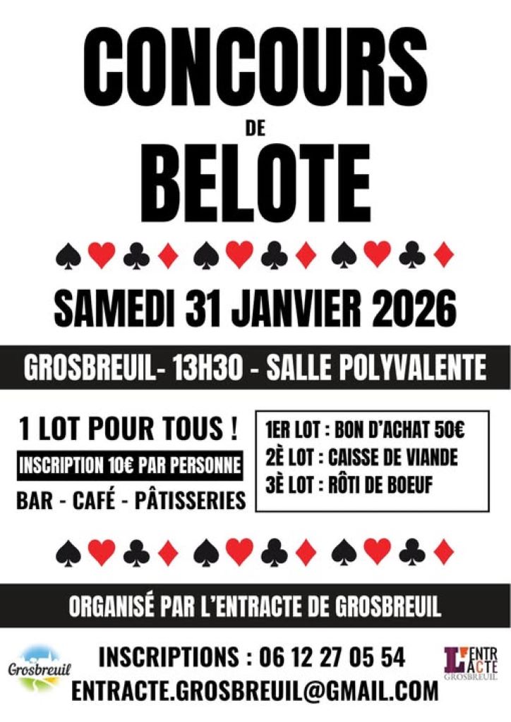 Agenda >>Fêtes populaires et animations de saison Concours de belote Organisé par l'entracte de Grosbreuil Description Inscription : 10€ par joueur 1 lot pour tous 1er Lot pour tous! 1er lot : bon d’achat de 50€ 2ème lot : caisse de viande 3ème lot : rôti de boeuf Bar – Café – Pâtisseries Pratique Date(s) de la manifestation : Du 31/01/2026 au 31/01/2026 Horaires de la manifestation13:30 Vous rendre à cet endroit Adresse de l'offre : Salle polyvalente85440 GROSBREUIL Contact : Association l'Entracte de Grosbreuil 06 12 27 05 54 entracte.grosbreuil@gmail.com Agenda Fêtes populaires et animations de saison