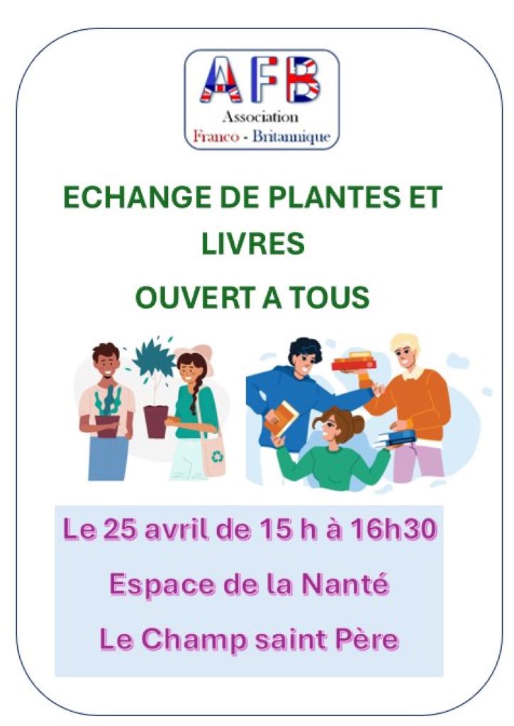 Agenda >>Fêtes populaires et animations de saison Echange de plantes et livres Organisé par l'association Franco-Britannique Description Ouvert à tous; Venez ÉCHANGER vos plantes, graines, livres.. Chaque personne peut apporter au maximum 6 livres (pas de dictionnaires, ni livres volumineux ou lourds) Pas de limite pour le nombre de plantes ou graines. Pratique Date(s) de la manifestation : Du 25/04/2026 au 25/04/2026 Horaires de la manifestation15:00 - 16:30 Vous rendre à cet endroit Adresse de l'offre : Espace de la Nanté85540 LE CHAMP-SAINT-PERE Contact : Association AFB Agenda Fêtes populaires et animations de saison