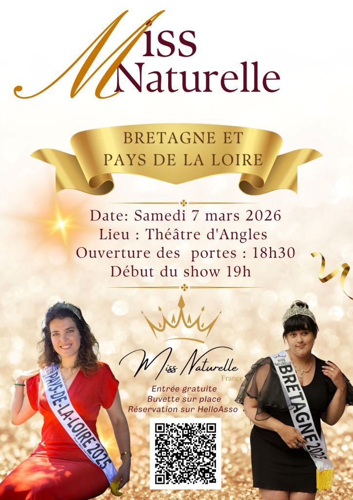 Agenda >>Fêtes populaires et animations de saison Election Régionale Miss Naturelle – Bretagne et Pays de la Loire Entrée gratuite Description Ouverte à tous les publics. Entrée gratuite Une buvette ainsi qu’une tombola seront proposées sur place. Les portes ouvriront à 18h30 afin d’accueillir le public, et le show débutera aux alentours de 19h, pour une durée estimée entre 2h et 2h30. Réservation sur Helloasso. Pratique Date(s) de la manifestation : Du 07/03/2026 au 07/03/2026 Horaires de la manifestation18:30 Vous rendre à cet endroit Adresse de l'offre : Théâtre municipalRue du stade85750 ANGLES Contact : SMAC Agenda Fêtes populaires et animations de saison
