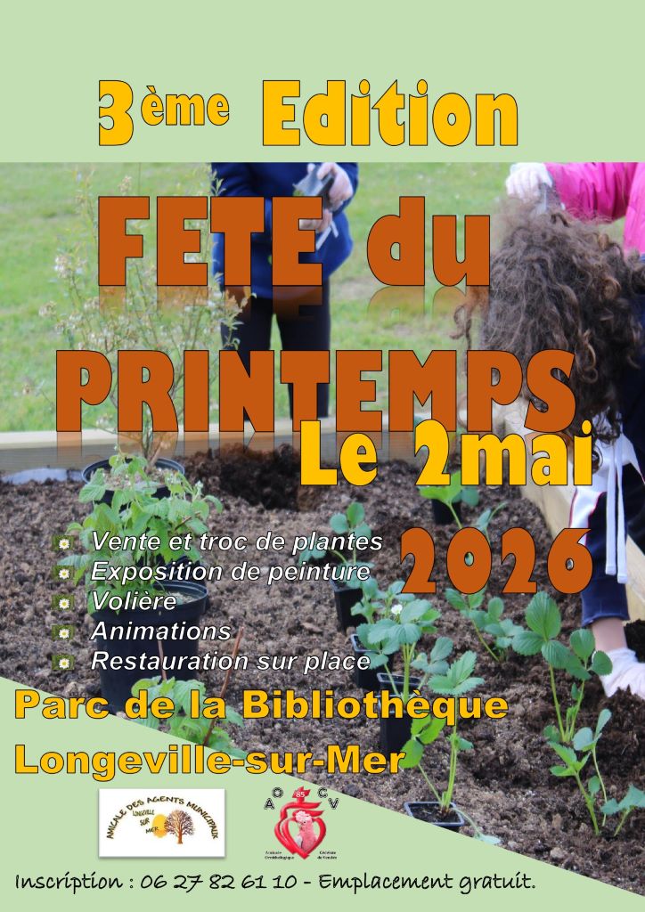 Agenda >>Fêtes populaires et animations de saison Fête du Printemps Organisée par l'Amicale des agents municipaux Description Vente et troc de plantes Expostionn de peintures Volière Animations Restauration sur place. Emplacement gratuit. Inscription par téléphone. Pratique Date(s) de la manifestation : Du 02/05/2026 au 02/05/2026 Vous rendre à cet endroit Adresse de l'offre : Parc de la bibliothèque85560 LONGEVILLE-SUR-MER Contact : Amicale des Agents Municipaux 06 27 82 61 10 Agenda Fêtes populaires et animations de saison