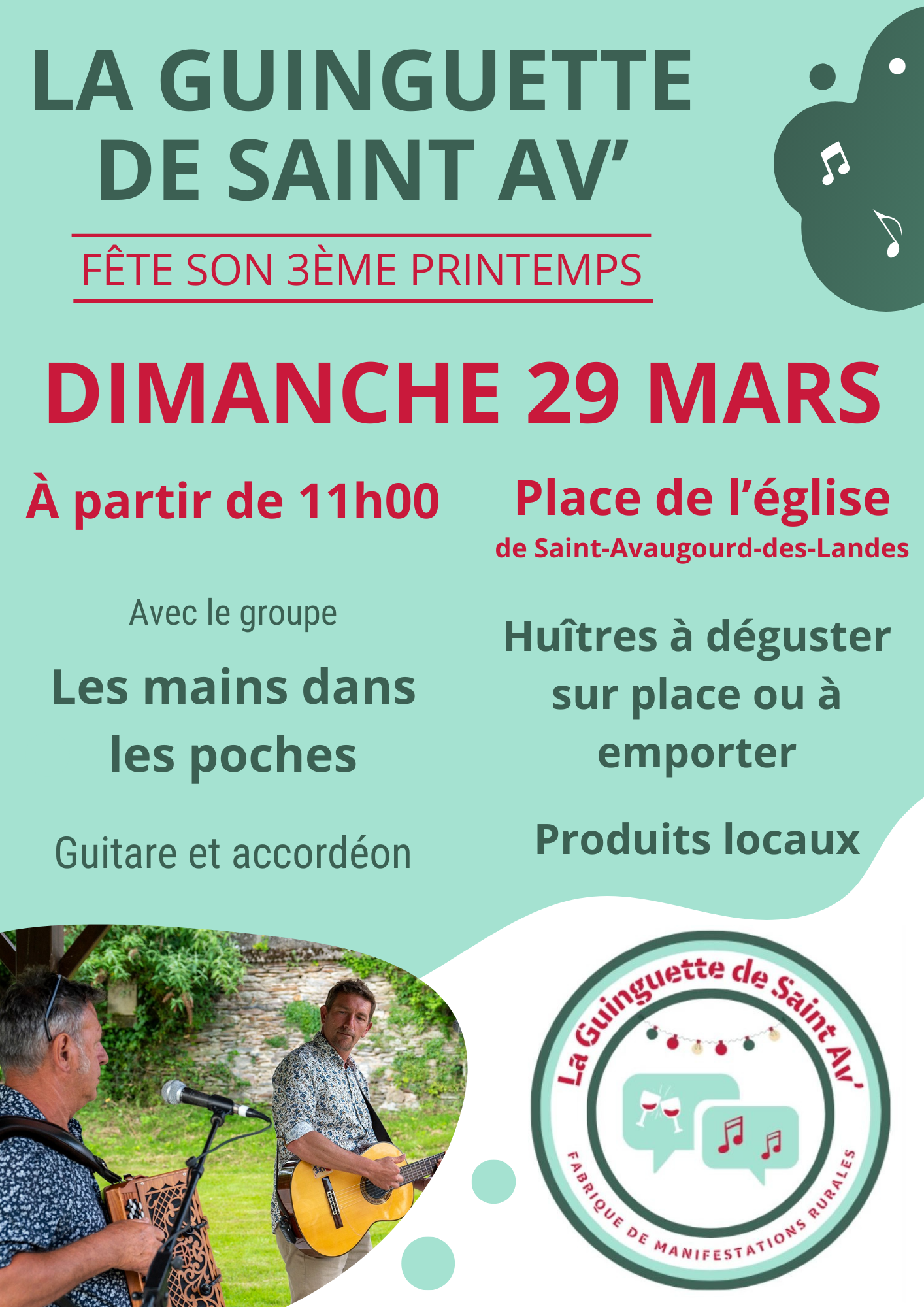 Agenda >>Fêtes populaires et animations de saison LA GUINGUETTE DE SAINT AV’ Fête son 3ème Printemps ! Description Vente à emporter et dégustation d’huîtres. Croque-monsieur à partager. Terrines de la Plume au Vent. Bière locale et vins. Avec le groupe « Les mains dans les poches » : Guitare et accordéon ! Pratique Date(s) de la manifestation : Du 29/03/2026 au 29/03/2026 Horaires de la manifestation11:00 - 14:00 Vous rendre à cet endroit Adresse de l'offre : Place François Favreau85540 SAINT-AVAUGOURD-DES-LANDES Contact : FABRIQUE DE MANIFESTATIONS RURALES fmr.saintavaugourd@gmail.com Agenda Fêtes populaires et animations de saison