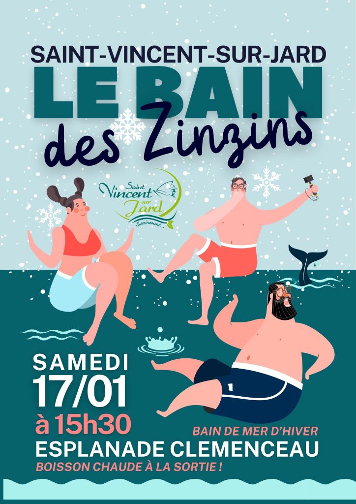 Agenda >>Fêtes populaires et animations de saison Le Bain des Zinzins Bain de mer d'hiver Description Ouvert à tous. Boisson chaude à la sortie. Pratique Date(s) de la manifestation : Du 17/01/2026 au 17/01/2026 Horaires de la manifestation15:30 Vous rendre à cet endroit Adresse de l'offre : Esplanade Clemenceau85520 SAINT-VINCENT-SUR-JARD Contact : Mairie 02 51 33 41 17 Agenda Fêtes populaires et animations de saison