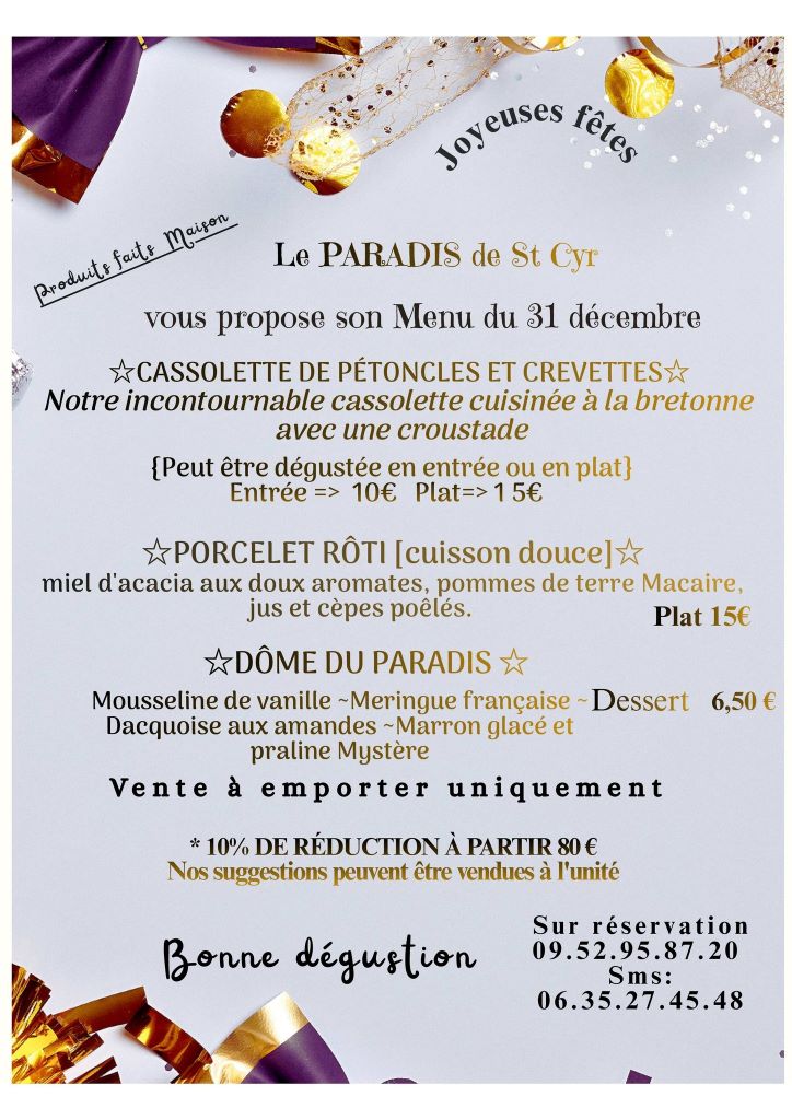 Agenda >>Fêtes populaires et animations de saison Le Paradis de Saint Cyr Le Paradis vous propose son menu pour les fêtes Description Menu spécial fêtes pour le 24 et le 31 décembre Les fêtes de fin d’année approchent, et avec elles l’envie de se retrouver autour d’une belle table. Pour l’occasion, notre restaurant vous propose un menu spécial fêtes, généreux et gourmand, élaboré avec des produits faits maison. Vente à emporter uniquement Sur réservation Pratique Date(s) de la manifestation : Du 24/12/2025 au 24/12/2025Du 31/12/2025 au 31/12/2025 Vous rendre à cet endroit Adresse de l'offre : 2 Rue Benjamin Fillon85540 SAINT-CYR-EN-TALMONDAIS Contact : Le Paradis de St Cyr 09.52.95.87.20 06.35.27.45.48 Agenda Fêtes populaires et animations de saison