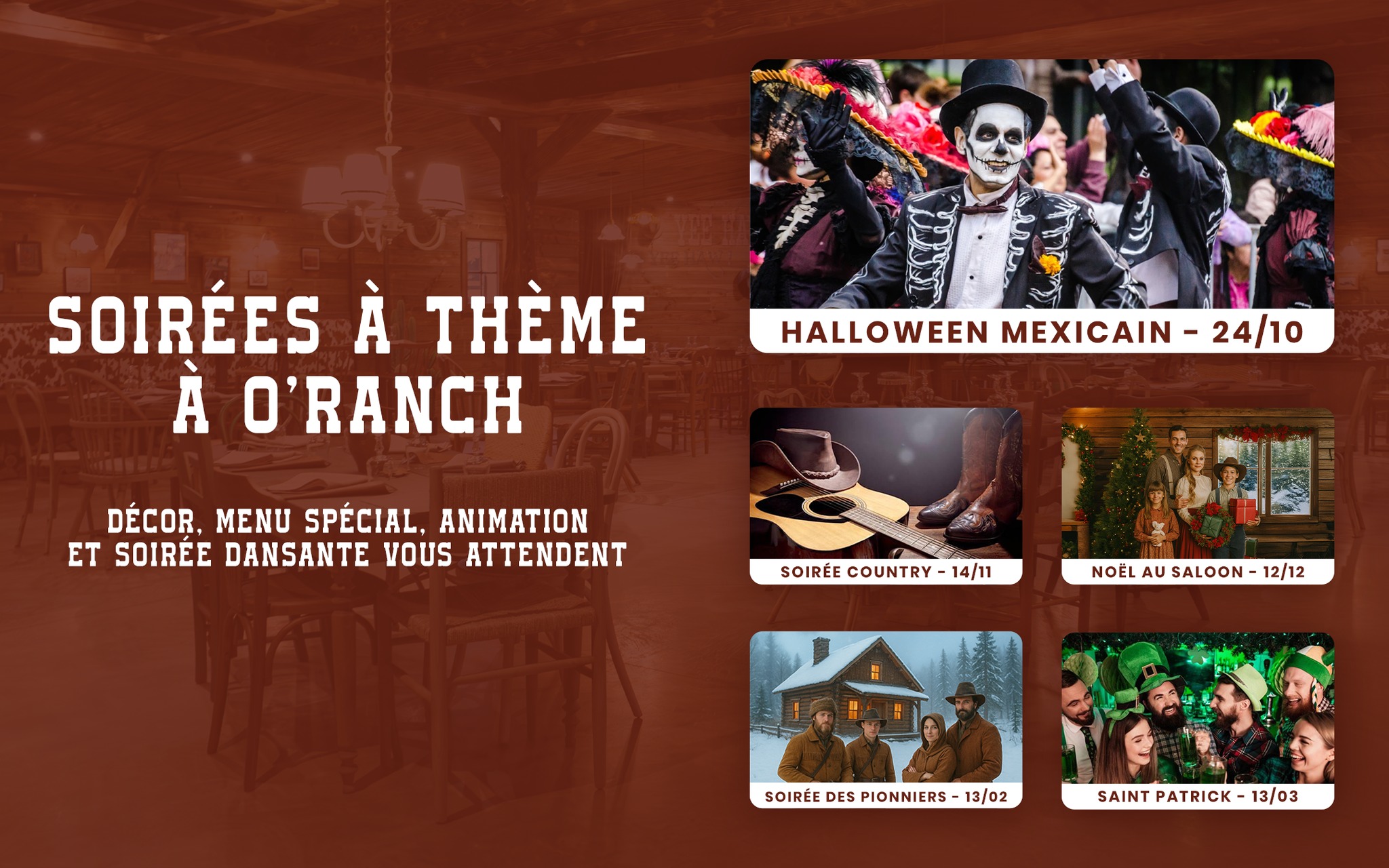 Une fois par mois, O’Ranch se transforme pour vous faire vivre une soirée hors du temps. Ambiance, décoration, menu et animations : chaque édition vous plonge dans un univers différent, pensé dans les moindres détails pour éveiller vos sens et surprendre vos papilles.