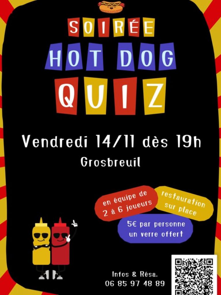 Agenda >>Fêtes populaires et animations de saison Soirée Hot-Dog Quizz Restauration sur place Description Equipe de 2 à 4 joueurs. Tarif : 5€ par personne + un verre offert Venez nombreux Pratique Date(s) de la manifestation : Du 14/11/2025 au 14/11/2025 Horaires de la manifestation19:00 Vous rendre à cet endroit Adresse de l'offre : Salle polyvalente85440 GROSBREUIL Contact : Mairie 06 85 97 48 89 Agenda Fêtes populaires et animations de saison