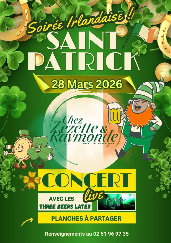 Agenda >>Fêtes populaires et animations de saison Soirée Irlandaise Saint Patrick Concert live avec les Three Beers Later Description Planches à partager Pratique Date(s) de la manifestation : Du 28/03/2026 au 28/03/2026 Vous rendre à cet endroit Adresse de l'offre : Bar chez Zézette et RaymondeCentre bourg85560 LE BERNARD Contact : Bar à manger Zézette et Raymonde 02 51 96 97 35 Agenda Fêtes populaires et animations de saison