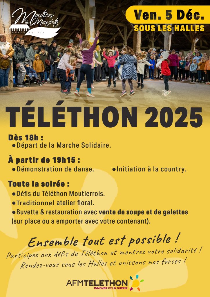Agenda >>Fêtes populaires et animations de saison Téléthon Ensemble tout est possible! Description Dès 18H : départ de la marche Solidaire A partir de 19H15 : démonstration de danse et initiation à la country Toute la soirée Défis du Téléthon Moutierrois Traditionnel atelier floral Buvette et restauration avec vente de soupe et de galettes (sur place u à emporter avec votre contenant). Participez aux défis du Téléthon et montrez votre solidarité – Unissons nos forces! Pratique Date(s) de la manifestation : Du 05/12/2025 au 05/12/2025 Horaires de la manifestation18:00 Vous rendre à cet endroit Adresse de l'offre : Sous les Halles85540 MOUTIERS-LES-MAUXFAITS Contact : Mairie Agenda Fêtes populaires et animations de saison