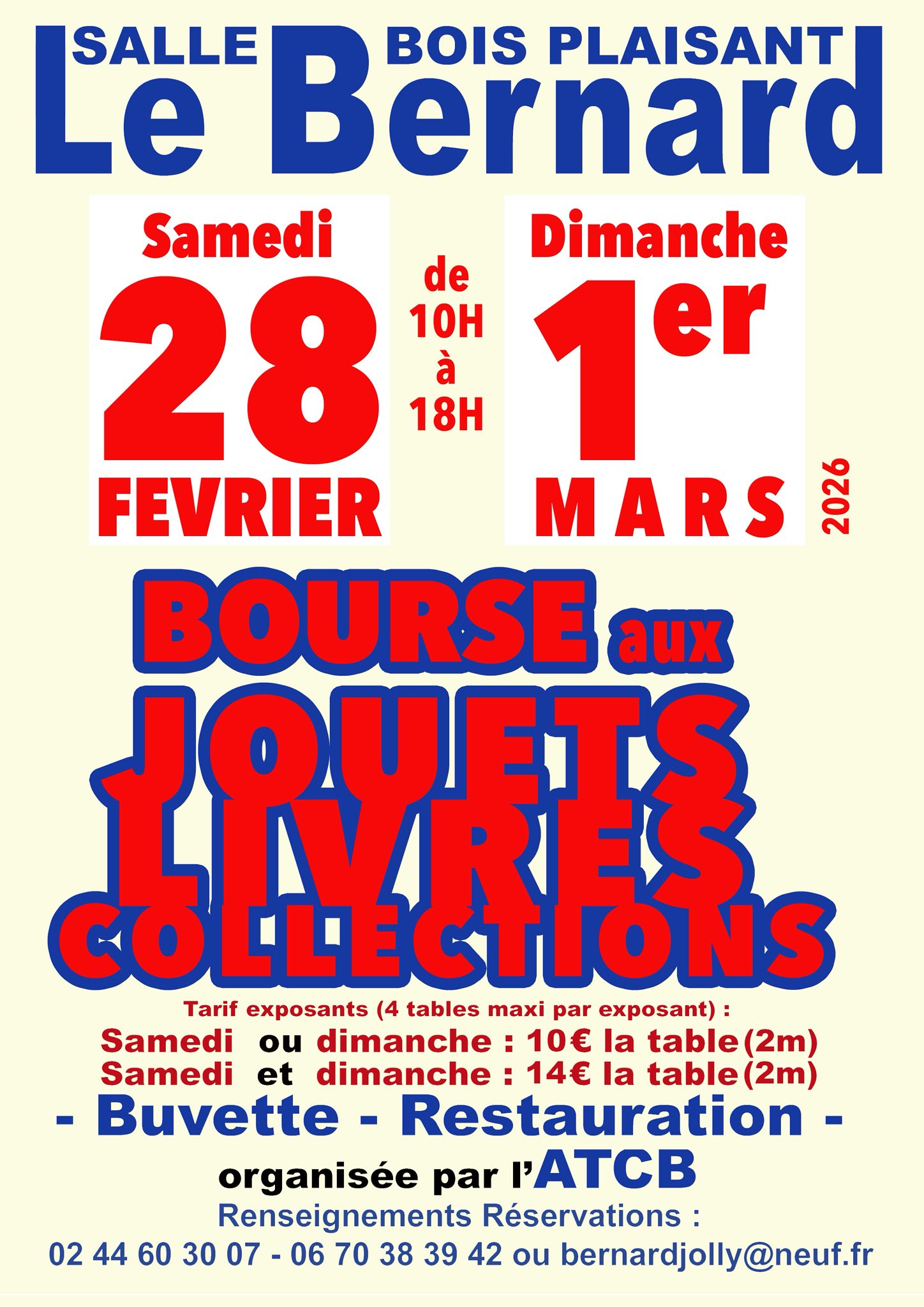 Agenda >>Vide-grenier, foires et marchés Bourse aux jouets, livres et collections Organisée par l'ATCB Description Vous pourrez y trouver toutes sortes de collections. Samedi ou dimanche : 10€ la table (2m) Samedi et dimanche : 14€ la table (2m) Tarif exposant : 4 tables maxi par personne Bar et restauration sur place. Pratique Date(s) de la manifestation : Du 28/02/2026 au 01/03/2026 Horaires de la manifestation10:00 - 18:00 Vous rendre à cet endroit Adresse de l'offre : Salle bois plaisantRue des Dolmens85560 LE BERNARD Contact : Association ATCB 02 44 60 30 07 06 70 38 39 42 bernardjolly@neuf.fr Agenda Vide-grenier, foires et marchés