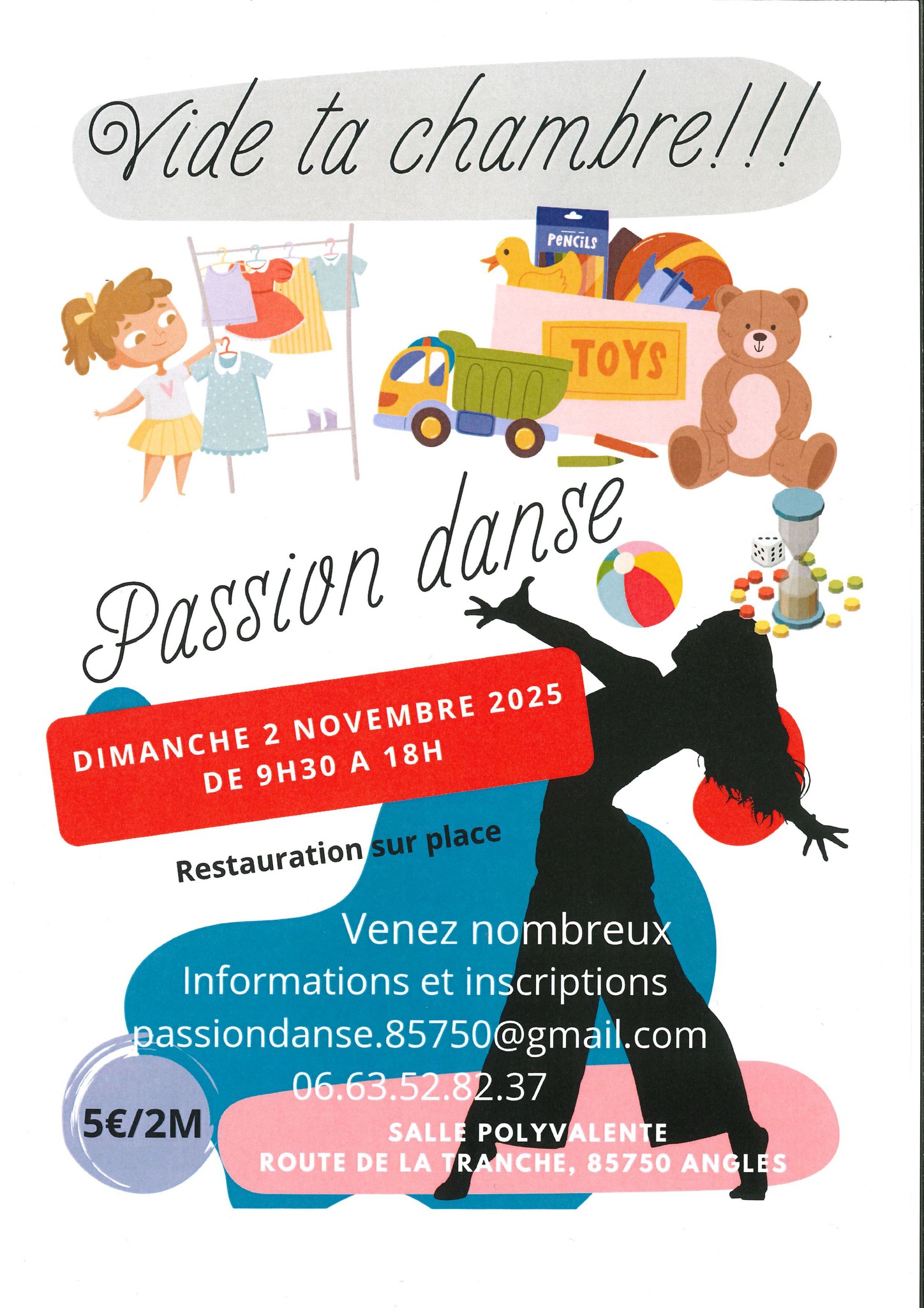 Agenda >>Vide-grenier, foires et marchés Vide ta chambre Par Passion Danse - Expo : 5€ pour 2mètres Description Informations et inscriptions au : –> par téléphone : 06 63 52 82 37 –> par mail : passiondanse.85750@gmail.com Restauration sur place. Pratique Date(s) de la manifestation : Du 02/11/2025 au 02/11/2025 Horaires de la manifestation09:30 - 18:00 Vous rendre à cet endroit Adresse de l'offre : Salle Polyvalente50 B Route de la Tranche sur Mer85750 ANGLES Contact : Association Passion Danse 06 63 52 82 37 passiondanse.85750@gmail.com Agenda Vide-grenier, foires et marchés