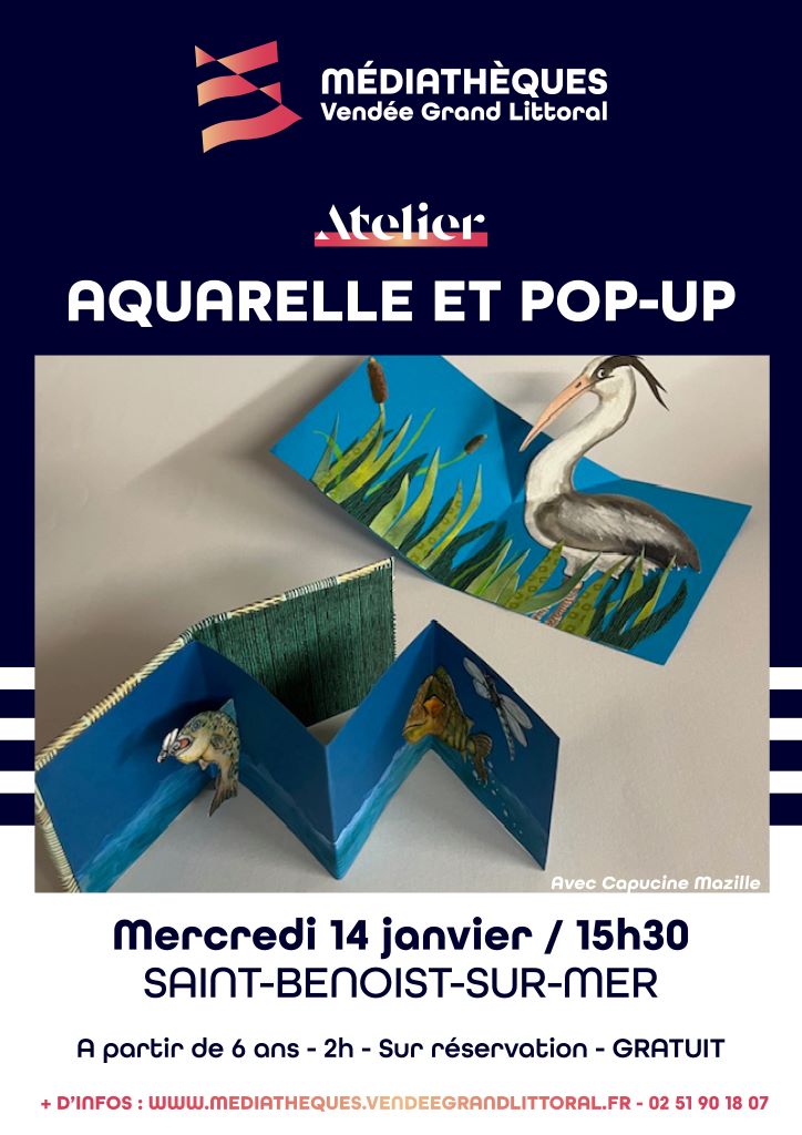 Agenda >>Loto - Concours de belote - Jeux - Atelier Atelier aquarelle et pop-up A partir de 6ans - Sur réservation Description Atelier mêlant la technique de l’aquarelle et la création pop-up, en lien avec l’ouvrage l’Odysée des rivières et par l’illustratrice Capucine Mazille. Durée : 2H Agenda complet des animations dans les médiathèques de Vendée Grand Littoral : Animations à venir . Pratique Date(s) de la manifestation : Du 14/01/2026 au 14/01/2026 Horaires de la manifestation15:30 Vous rendre à cet endroit Adresse de l'offre : Médiathèque85540 SAINT-BENOIST-SUR-MER https://vendeegrandlittoral-pom.c3rb.org/ Documents téléchargeables : Programme Médiathèques VGL 2025-2026 Contact : Réseau des Bibliothèques & Médiathèques Vendée Grand Littoral 02 51 90 18 07 Agenda Loto - Concours de belote - Jeux - Atelier