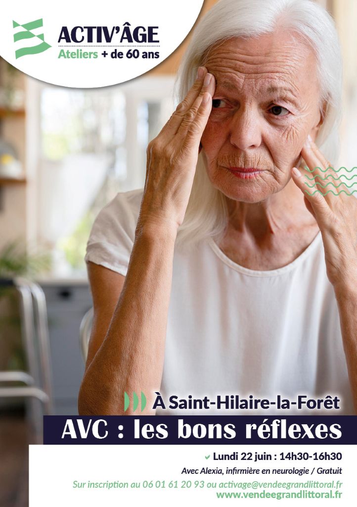Agenda >>Loto - Concours de belote - Jeux - Atelier Atelier – AVC : les bons réflexes Echange sur l'AVC Description Chaque année, l’AVC touche près de 150 000 personnes, à tout âge. Savoir reconnaître rapidement les signes permet d’accéder à un traitement d’urgence et de limiter les séquelles. Venez en discuter et poser vos questions lors de cet atelier. Avec Alexia, infirmière en neurologie. Gratuit. Inscription à partir du jeudi 8 janvier 2026 auprès du service Prévention Santé. Si vous n’avez pas de moyen de locomotion, des solutions peuvent vous être proposées : covoiturage, déplacement solidaire… Pratique Date(s) de la manifestation : Du 22/06/2026 au 22/06/2026 Horaires de la manifestation14:30 - 16:30 Vous rendre à cet endroit Adresse de l'offre : Salle polyvalente85440 SAINT-HILAIRE-LA-FORET www.mediatheques.vendeegrandlittoral.fr Documents téléchargeables : Programme activage séniors janvier-juin 2026 Contact : Vendée Grand Littoral 06 01 61 20 93 activage@vendeegrandlittoral.fr Agenda Loto - Concours de belote - Jeux - Atelier