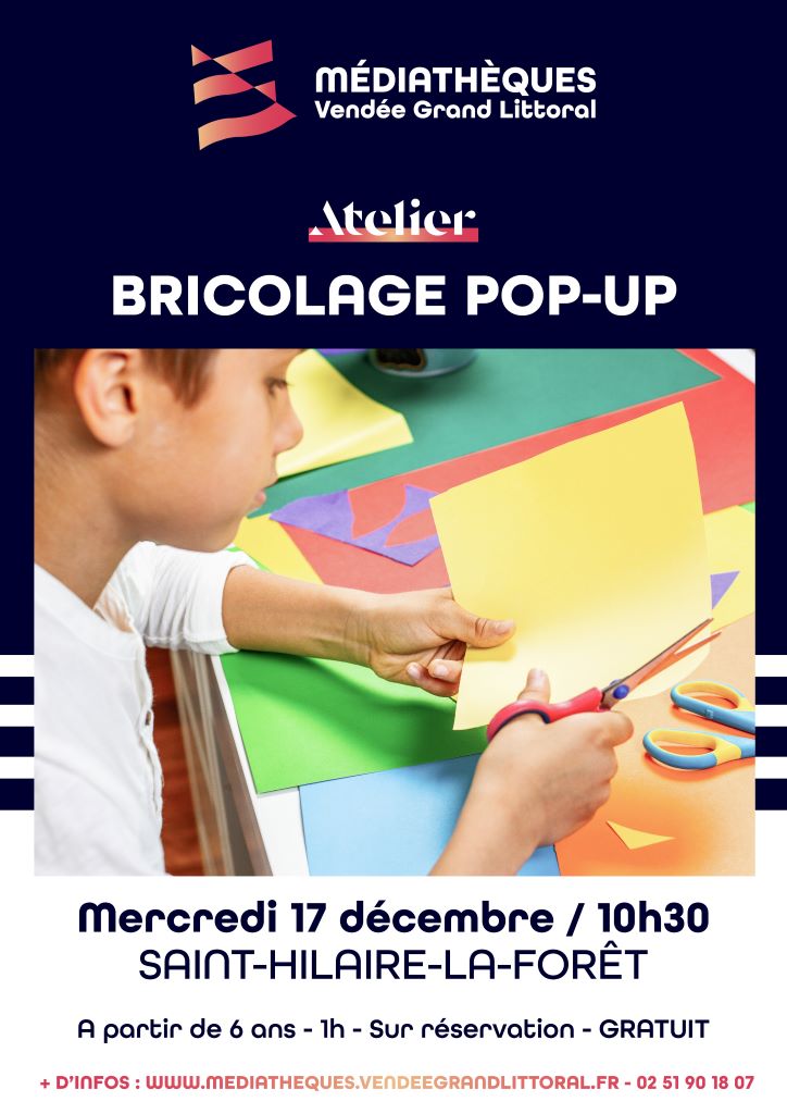 Agenda >>Loto - Concours de belote - Jeux - Atelier Atelier bricolage Pop-Up A partir de 6 ans - Sur réservation Description Fabrication de cartes Pop-Up. Durée : 1H Agenda complet des animations dans les médiathèques de Vendée Grand Littoral : Animations à venir . Pratique Date(s) de la manifestation : Du 17/12/2025 au 17/12/2025 Horaires de la manifestation10:30 Vous rendre à cet endroit Adresse de l'offre : Médiathèque85440 SAINT-HILAIRE-LA-FORET https://vendeegrandlittoral-pom.c3rb.org/ Documents téléchargeables : Programme Médiathèques VGL 2025-2026 Contact : Réseau des Bibliothèques & Médiathèques Vendée Grand Littoral 02 51 90 18 07 Agenda Loto - Concours de belote - Jeux - Atelier