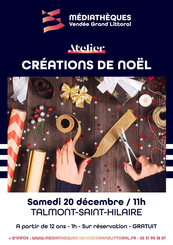 Agenda >>Loto - Concours de belote - Jeux - Atelier Atelier création De Noël A partir de 12ans - Sur réservation Description Plongez dans la magie de Noël et laissez parler votre créativité lors d’un atelier convivial où papier, couleurs et imagination s’uniront pour illuminer l’hiver! Durée : 1H Agenda complet des animations dans les médiathèques de Vendée Grand Littoral : Animations à venir . Pratique Date(s) de la manifestation : Du 20/12/2025 au 20/12/2025 Horaires de la manifestation11:00 Vous rendre à cet endroit Adresse de l'offre : Médiathèque85440 TALMONT-SAINT-HILAIRE https://vendeegrandlittoral-pom.c3rb.org/ Documents téléchargeables : Programme Médiathèques VGL 2025-2026 Contact : Réseau des Bibliothèques & Médiathèques Vendée Grand Littoral 02 51 90 18 07 Agenda Loto - Concours de belote - Jeux - Atelier