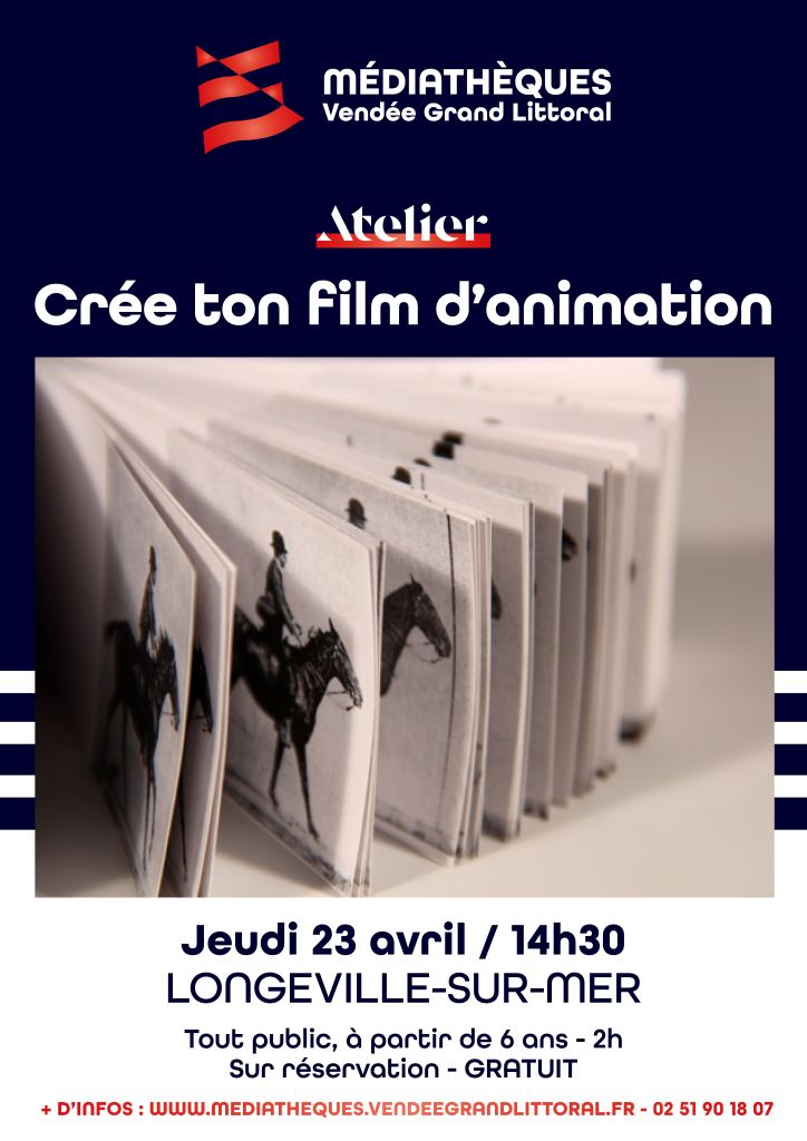Agenda >>Loto - Concours de belote - Jeux - Atelier Atelier – Crée ton film d’animation Tout public - A partir de 6ans - Sur réservation Description Fabrication d’une folioscope. Durée : 2H Agenda complet des animations dans les médiathèques de Vendée Grand Littoral : Animations à venir . Pratique Date(s) de la manifestation : Du 23/04/2026 au 23/04/2026 Horaires de la manifestation14:30 Vous rendre à cet endroit Adresse de l'offre : Médiathèque85560 LONGEVILLE-SUR-MER https://vendeegrandlittoral-pom.c3rb.org/ Documents téléchargeables : Programme Médiathèques VGL 2025-2026 Contact : Réseau des Bibliothèques & Médiathèques Vendée Grand Littoral 02 51 90 18 07 Agenda Loto - Concours de belote - Jeux - Atelier