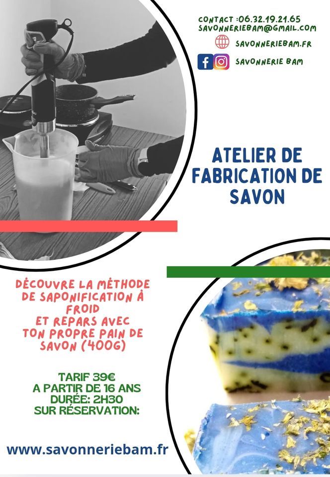 Agenda >>Loto - Concours de belote - Jeux - Atelier Atelier de Fabrication de savon Venez découvrir l'art de la saponification à froid, et repartez avec votre propre pain de savon! Description Un atelier de fabrication où vous serez guidé pour la réalisation de votre savon artisanal, à base d’ingrédients bio. Matières premières et équipement fournis. Vous repartirez avec un pain de savon d’environ 400g! Durée : environ 2h30 Tarif : 39€/ personne A partir de 16 ans Pratique Date(s) de la manifestation : Du 07/02/2026 au 07/02/2026 Horaires de la manifestation14:00 - 16:30 Vous rendre à cet endroit Adresse de l'offre : 990 CHEMIN DE BEAUCHENEChemin de Beauchêne85440 AVRILLE Contact : Savonnerie Bam 06 32 19 21 65 savonneriebam@gmail.com Agenda Loto - Concours de belote - Jeux - Atelier