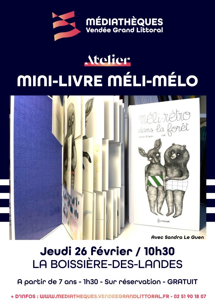 Agenda >>Loto - Concours de belote - Jeux - Atelier Atelier Mini-livre méli-mélo A partir de 7ans - Sur réservation Description Création d’un mini-livre méli-mélo avec Sandra Le Guen, illustratrice de livres. Durée : 1H30 Agenda complet des animations dans les médiathèques de Vendée Grand Littoral : Animations à venir . Pratique Date(s) de la manifestation : Du 26/02/2026 au 26/02/2026 Horaires de la manifestation10:30 Vous rendre à cet endroit Adresse de l'offre : Médiathèque85430 LA BOISSIERE-DES-LANDES https://vendeegrandlittoral-pom.c3rb.org/ Documents téléchargeables : Programme Médiathèques VGL 2025-2026 Contact : Réseau des Bibliothèques & Médiathèques Vendée Grand Littoral 02 51 90 18 07 Agenda Loto - Concours de belote - Jeux - Atelier