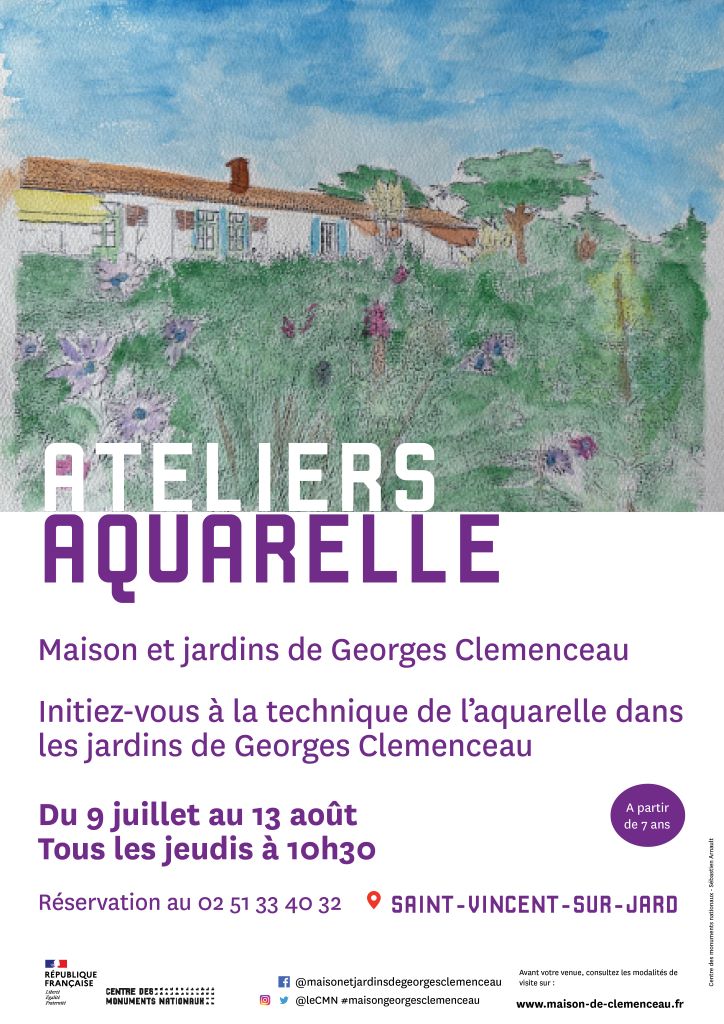Agenda >>Loto - Concours de belote - Jeux - Atelier Ateliers aquarelle A partir de 7ans - Sur réservation Description Tous les jeudis du 9 juillet au 13 août. Initiez-vous à la technique de l’aquarelle dans les jardins de Georges Clemenceau. Renseignements et réservations par téléphone. Sur réservation. Pratique Date(s) de la manifestation : Du 09/07/2026 au 13/08/2026 Horaires de la manifestation10:30 Vous rendre à cet endroit Adresse de l'offre : Maison Georges ClemenceauRue Georges Clemenceau85520 SAINT-VINCENT-SUR-JARD www.maison.de.clemenceau.fr Contact : Maison et jardins de Georges Clemenceau 02 51 33 40 32 Agenda Loto - Concours de belote - Jeux - Atelier