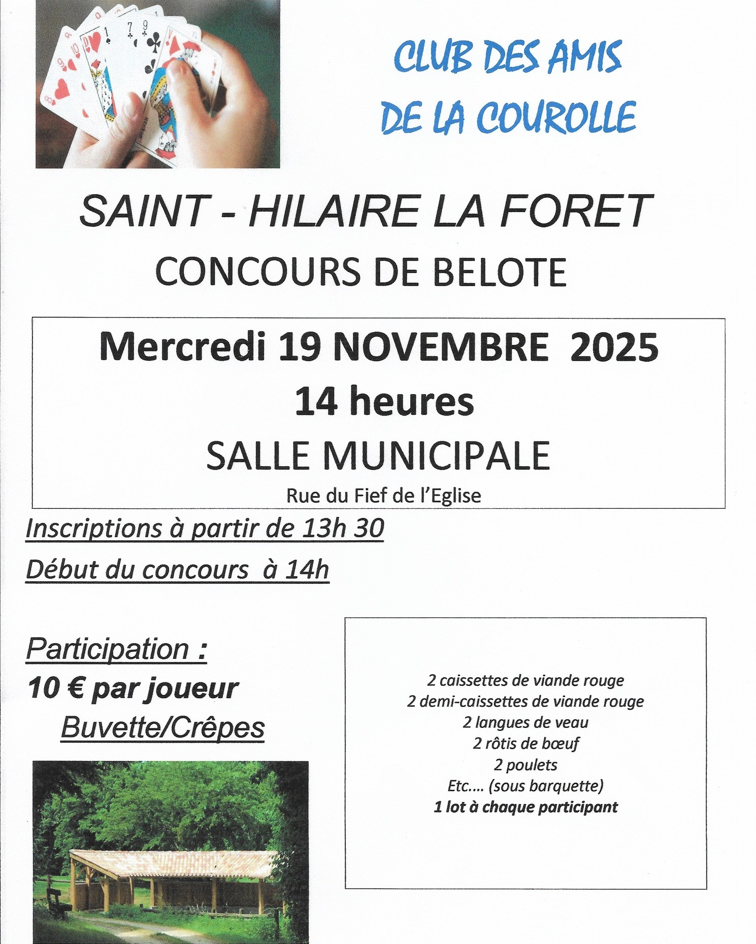 Agenda >>Loto - Concours de belote - Jeux - Atelier Concours de Belote Organisé par le Club des Amis de la Courolle - Payant, sans réservation Description Venez participer au concours de belote organisé par le Club des Amis de la Courolle (sans réservation). 10€ par joueur. Inscription à 13h30. Jeux à 14h00. Buvette et vente de crêpes. Pratique Date(s) de la manifestation : Du 19/11/2025 au 19/11/2025 Horaires de la manifestation13:30Précisions sur les ouverturesDébut des jeux à 14h Vous rendre à cet endroit Adresse de l'offre : Salle MunicipaleRue du Fief de l'Église85440 SAINT-HILAIRE-LA-FORET Contact : Club des Amis de la Courolle Agenda Loto - Concours de belote - Jeux - Atelier