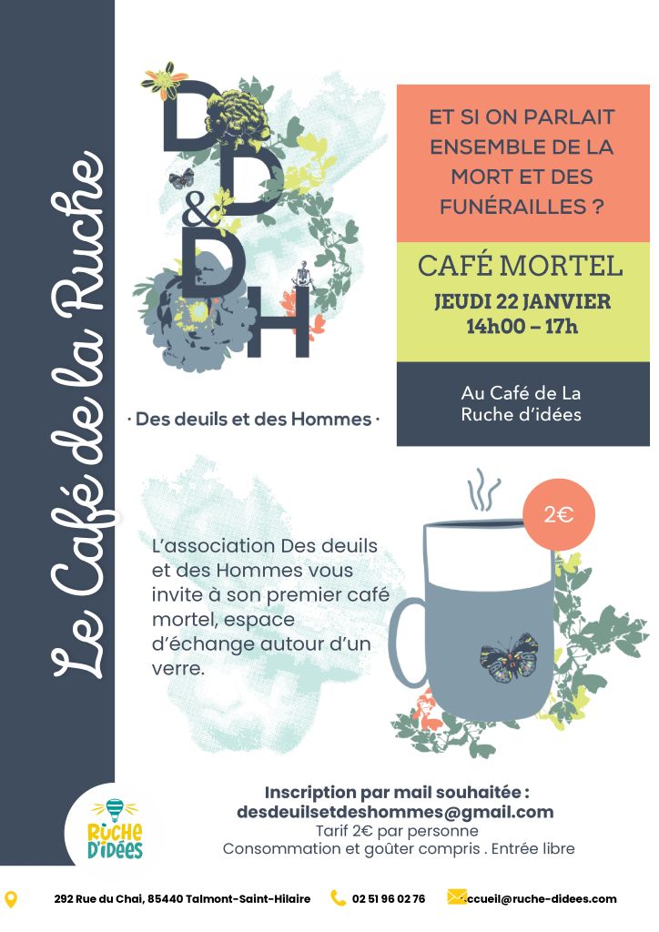 En partenariat avec L’association des Deuils et des hommes, La Ruche organise un Café mortel jeudi 22 janvier 2026 de 14h30 à 17h.