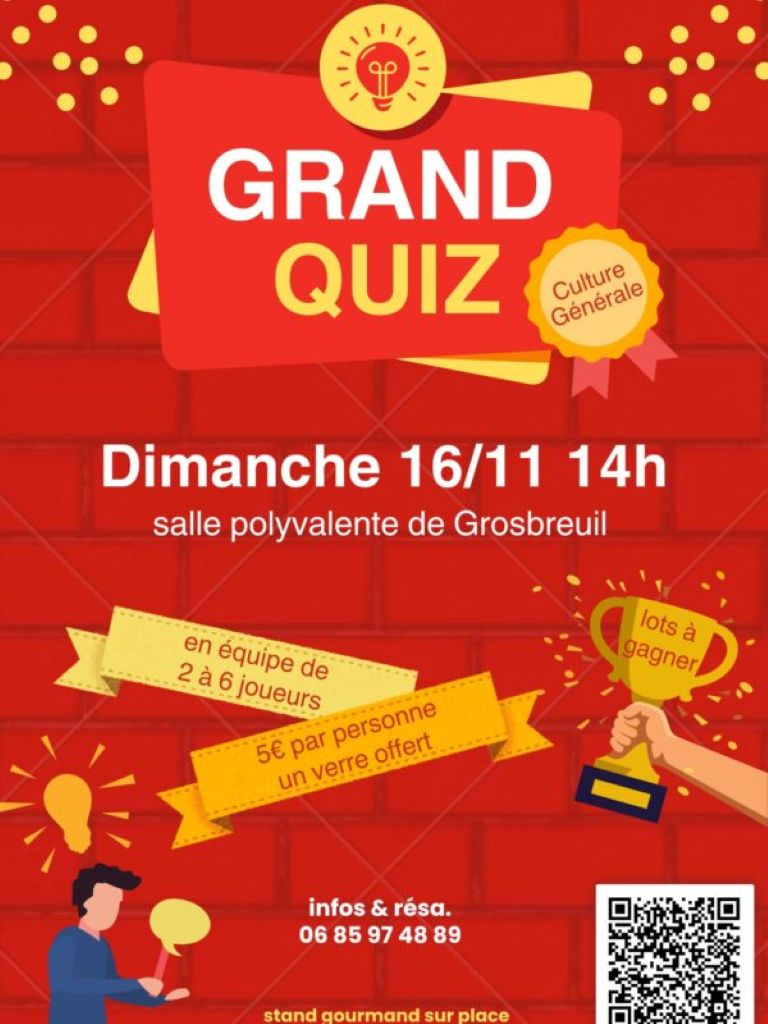 Agenda >>Loto - Concours de belote - Jeux - Atelier Grand Quizz – Culture générale Lots à gagner Description Equipe de 2 à 6 joueurs. Tarif : 5€ par personne + un verre offert Stand gourmand sur place. Information et réservation par téléphone. Pratique Date(s) de la manifestation : Du 16/11/2025 au 16/11/2025 Horaires de la manifestation14:00 Vous rendre à cet endroit Adresse de l'offre : Salle polyvalente85440 GROSBREUIL Contact : Mairie 06 85 97 48 89 Agenda Loto - Concours de belote - Jeux - Atelier