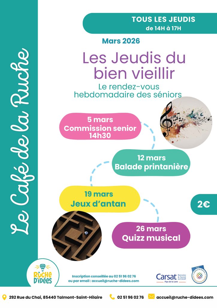 Agenda >>Loto - Concours de belote - Jeux - Atelier Le jeudis du bien veillir Organisé par La Ruche d'idées Description Spécial Jeux d’antan Osselets, jeux des bords des chemins, marelle, billes … venez redécouvrir vos jeux d’enfance. Un moment ludique à partager ! Gratuit – Ouvert à tous Pratique Date(s) de la manifestation : Du 19/03/2026 au 19/03/2026 Horaires de la manifestation14:00 - 17:00 Vous rendre à cet endroit Adresse de l'offre : La Ruche d'idées292 Rue du Chai85440 TALMONT-SAINT-HILAIRE https://ruche-didees.centres-sociaux.fr/ Contact : La Ruche d'idées 02 51 96 02 76 Agenda Loto - Concours de belote - Jeux - Atelier