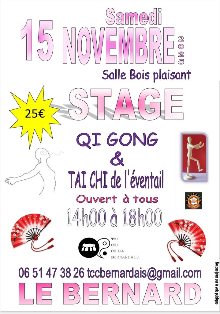 Agenda >>Loto - Concours de belote - Jeux - Atelier Stage de Qi Gong et Tai Chi l’Éventail Ouvert à tous, débutant comme confirmé. Description Venez découvrir et surtout pratiquer un QI-GONG et une forme le Tai Chi de l’éventail . Ce stage permet de découvrir d’autre forme de Qi Gon et de Tai Chi Chuan, qui ne sont pas dans nos cours hebdomadaires, de partager avec des débutants qui ne connaitrait pas notre activités Pratique Date(s) de la manifestation : Du 15/11/2025 au 15/11/2025 Horaires de la manifestation14:00 - 18:00 Vous rendre à cet endroit Adresse de l'offre : Salle Bois Plaisant21 Rue des Dolmens85560 LE BERNARD Contact : Tai Chi Chuan Bernardais 06 51 47 38 26 tccbernardais@gmail.com Agenda Loto - Concours de belote - Jeux - Atelier