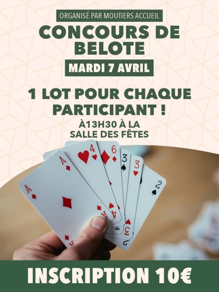 Agenda >>Manifestation sportive Concours de belote Organisé par Moutiers Accueil Description Ouverture des portes à 13H30. 1 lot pour chaque participant. Tarif : 10€ par personne. Buvette – Café – Gaufre Pratique Date(s) de la manifestation : Du 07/04/2026 au 07/04/2026 Horaires de la manifestation13:30 Vous rendre à cet endroit Adresse de l'offre : Salle des fêtesRoute de la Tranche85540 MOUTIERS-LES-MAUXFAITS Contact : Association Moutiers Accueil Agenda Manifestation sportive