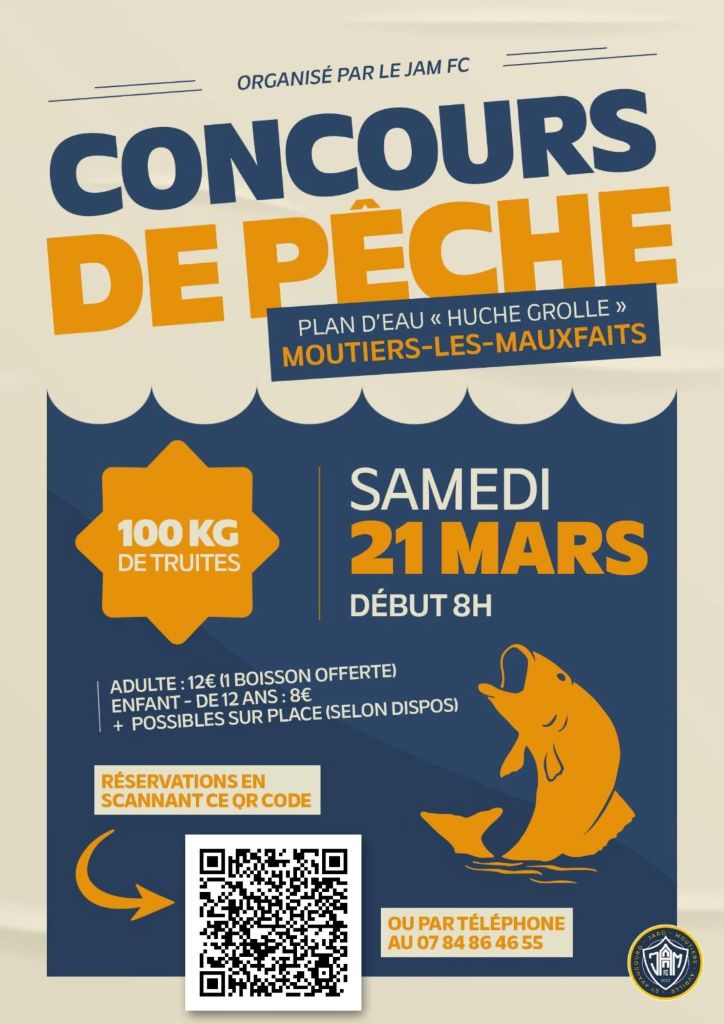 Agenda >>Randonnées et visites Concours de Pêche Organisé par le JAM FC Description 100kg de truites. Adulte : 12€ (1boisson offerte Enfant de moins de 12ans : 8€ Réservation par téléphone possibles. Pratique Date(s) de la manifestation : Du 21/03/2026 au 21/03/2026 Horaires de la manifestation08:00 Vous rendre à cet endroit Adresse de l'offre : Plan d'eau Huche Grolle85540 MOUTIERS-LES-MAUXFAITS Contact : Association Jam Jc 07 84 86 46 55 Agenda Randonnées et visites