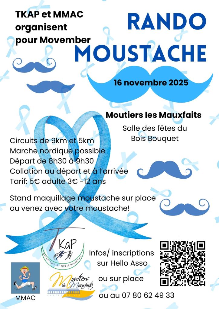 Agenda >>Randonnées et visites Rando Moustache 2 circuits proposés Description Circuit de 9km et 5km. Marche nordique possible. Départ de 8H30 à 9H30. Collation au départ et à l’arrivée. Tarif : 5€ par adulte et 3€ pour les moins de 12ans. Stand maquillage moustache sur place ou venez avec votre moustache! Inscriptions sur helloasso, par téléphone ou sur place. Organisée par les associations TKAP et MMAC. Pratique Date(s) de la manifestation : Du 16/11/2025 au 16/11/2025 Vous rendre à cet endroit Adresse de l'offre : Salle des fêtes du bois bouquet85540 MOUTIERS-LES-MAUXFAITS Contact : Associations TKAP - MMAC 07 80 62 49 33 Agenda Randonnées et visites