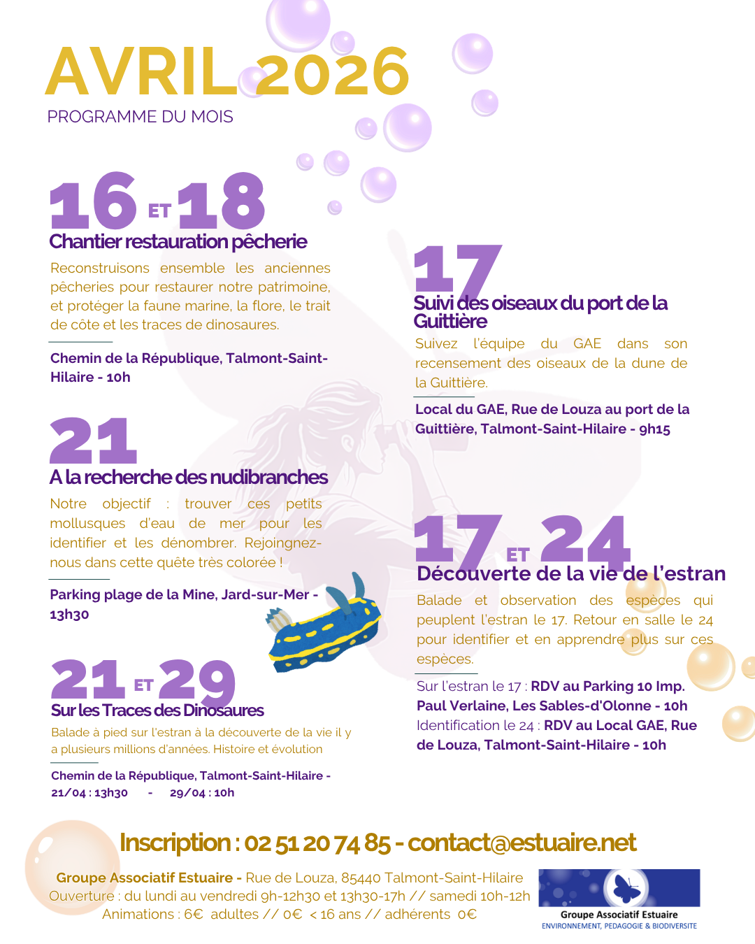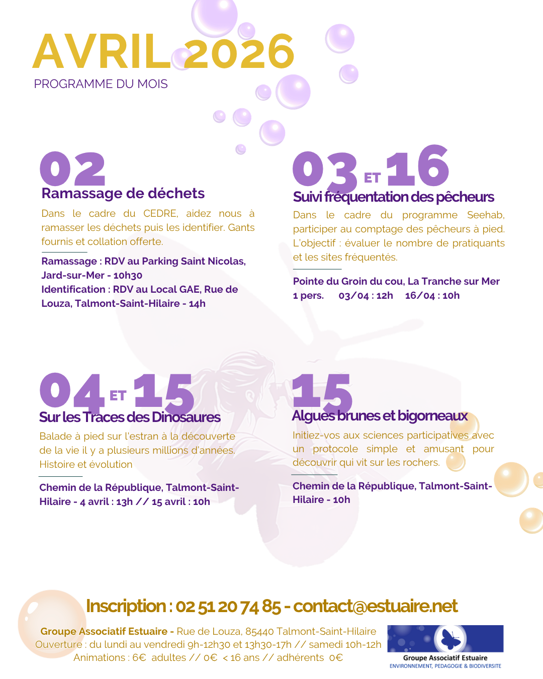 Agenda >>Randonnées et visites Sur les Traces des Dinausores Balade à pied sur l'estran Description Découverte de la vie il y a plusieurs millions d’années. Histoire et évolution. Sortie accompagnée par un expert de la nature : Mr Guichard. Gratuit Pratique Date(s) de la manifestation : Du 21/04/2026 au 21/04/2026 Horaires de la manifestation13:30Du 29/04/2026 au 29/04/2026 Horaires de la manifestation10:00 Vous rendre à cet endroit Adresse de l'offre : Chemin de la République85440 TALMONT-SAINT-HILAIRE Contact : Groupe Associatif Estuaire 02 51 20 74 85 contact@estuaire.net Agenda Randonnées et visites