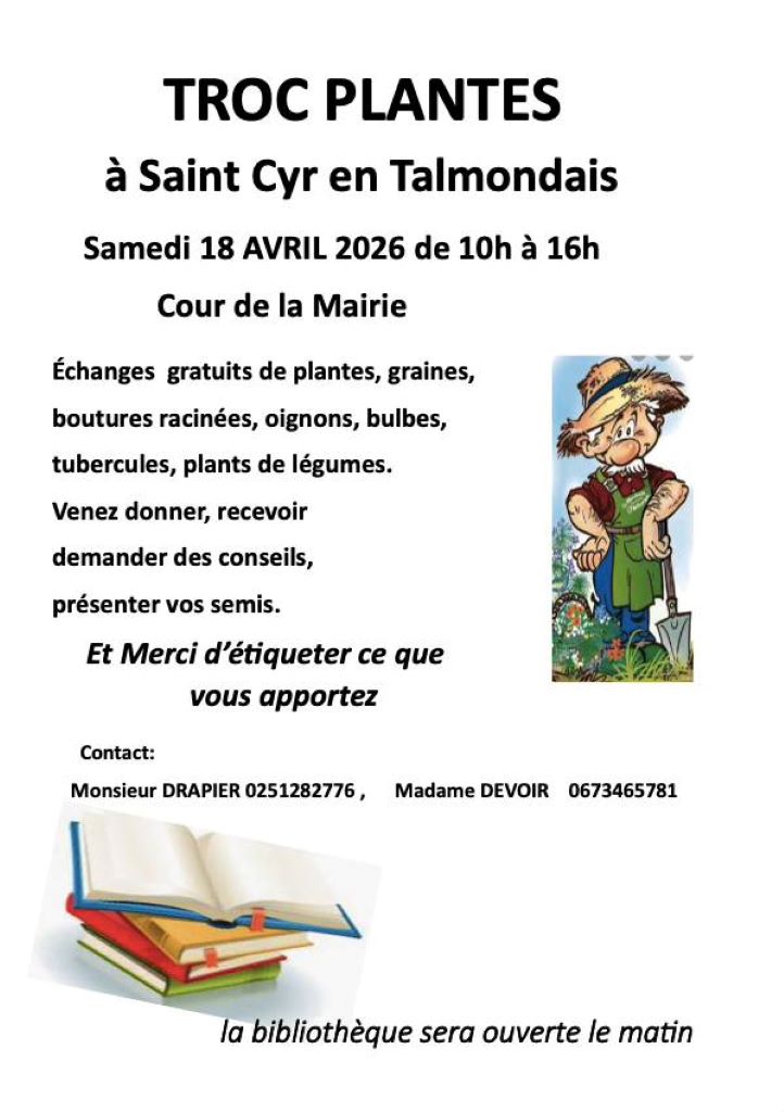 Agenda >>Sortie nature - environnement Troc Plantes Vous pourrez profiter de l'ouverture de la bibliothèque également Description Echanges gratuits de plantes, graines, boutures racinées, oignons, bulbes, tubercules, plants de légumes. Venez donner et recevoir des conseils, présenter vos semis. Merci d’étiqueter ce que vous apportez. Pratique Date(s) de la manifestation : Du 18/04/2026 au 18/04/2026 Horaires de la manifestation10:00 - 16:00 Vous rendre à cet endroit Adresse de l'offre : Cour de la Mairie85540 SAINT-CYR-EN-TALMONDAIS Contact : Mairie 02 51 28 27 76 06 73 46 57 81 Agenda Sortie nature - environnement