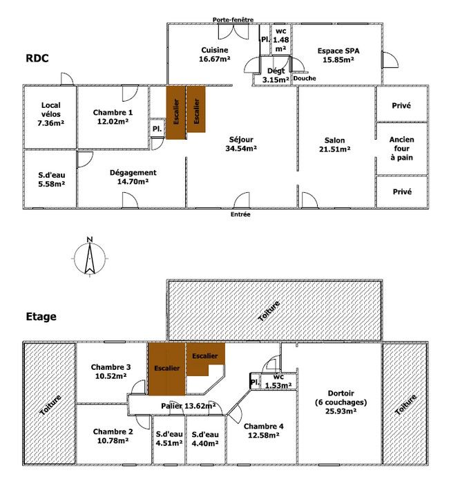 À l’étage, découvrez trois chambres spacieuses et un dortoir de 26m² avec diverses options de couchage, ainsi que deux salles d’eau et deux wc indépendants, garantissant votre confort et votre intimité.